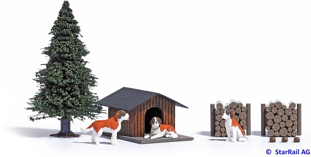 Diese drei süßen Bernhardiner bringen Leben in deine Modellbahn-Landschaft! Im H0-Maßstab sitzen, liegen und stehen die treuen Hunde bereit, um deine Anlage zu verschönern. Das Set enthält nicht nur die drei verschiedenen Hunde, sondern auch passendes Zubehör: Ein Erste-Hilfe-Rumfässchen, einen Holzstapel, eine Edeltanne mit Wurzelfuß (50mm hoch) und eine niedliche Hundehütte aus echtem Holz. Perfekt für eine Alpszenerie oder einen Bauernhof-Bereich. Die Details sind liebevoll ausgearbeitet - jeder Hund hat seinen eigenen Charakter. Einfach aufstellen und deine Modellbahn-Welt wird sofort lebendiger und authentischer. Ein Muss für jeden Modellbahn-Fan, der seine Landschaft mit liebevollen Details bereichern will!