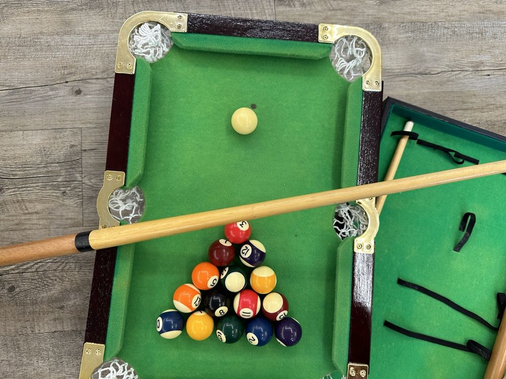 Im Lieferumfang ist wirklich alles dabei, was du brauchst: 16 Bälle (1 weiße und 15 farbige), 2 Queues à 92 cm Länge, 2 Kreiden, 1 Ball-Dreieck und 1 Bürste. Einfach auspacken und sofort losspielen!