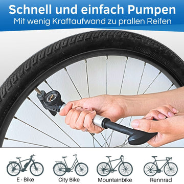 Hey Fahrradfans, diese Mini-Pumpe von TWIRL ist der absolute Gamechanger für unterwegs! Sie ist nur 25 cm klein, wiegt lächerliche 94 Gramm und passt in jede Tasche. Aber keine Sorge - klein aber oho! Der ausziehbare Schlauch macht das Pumpen super einfach und der Doppelkopf passt auf alle Ventile: Schrader (rot) und Presta (blau). Bis zu 11 bar oder 160 PSI schafft das Ding - damit kriegt ihr auch den hartnäckigsten Mountainbike-Reifen voll. Das Aluminium-Gehäuse ist mega robust und die Kunststoffgriffe liegen gut in der Hand. Mit dabei: Halterung und Sicherheitsklettverschluss für die sichere Montage am Rahmen. Perfekt für die schnelle Reparatur unterwegs oder für alle, die kein schweres Equipment mitschleppen wollen. Egal ob City-Bike, Rennrad oder MTB - mit dieser Pumpe seid ihr immer auf der sicheren Seite! Einfach unverzichtbar für jede Tour!
