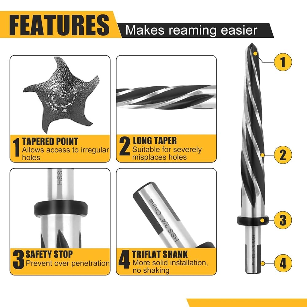 Hey, für präzise Bohrungen im Metallbau ist diese HSS-Reibahle genau das Richtige! Mit 3/4 Zoll Schnittdurchmesser und 1/2 Zoll Schaftdurchmesser ist sie perfekt für Brückenbau, Stahlkonstruktionen und Metallarbeiten. Das High-Speed-Stahl-Material (HSS6542/M2) ist mega robust und hält ewig. Die 5-Schneiden-Technologie sorgt für saubere, präzise Löcher ohne Rissbildung. Einfach in vorhandene Löcher einführen - sie richtet aus und vergrößert in einem Durchgang. Super für Stahl, Aluminium, Messing, Kunststoff und mehr. Kommt mit praktischer Aufbewahrungsbox. Damit sparst du dir Zeit und Ärger bei deinen Projekten. Ob Profi oder Heimwerker - mit diesem Teil werden deine Bohrungen perfekt! Einfach ins Bohrgerät einspannen und loslegen. Qualität, die sich lohnt!