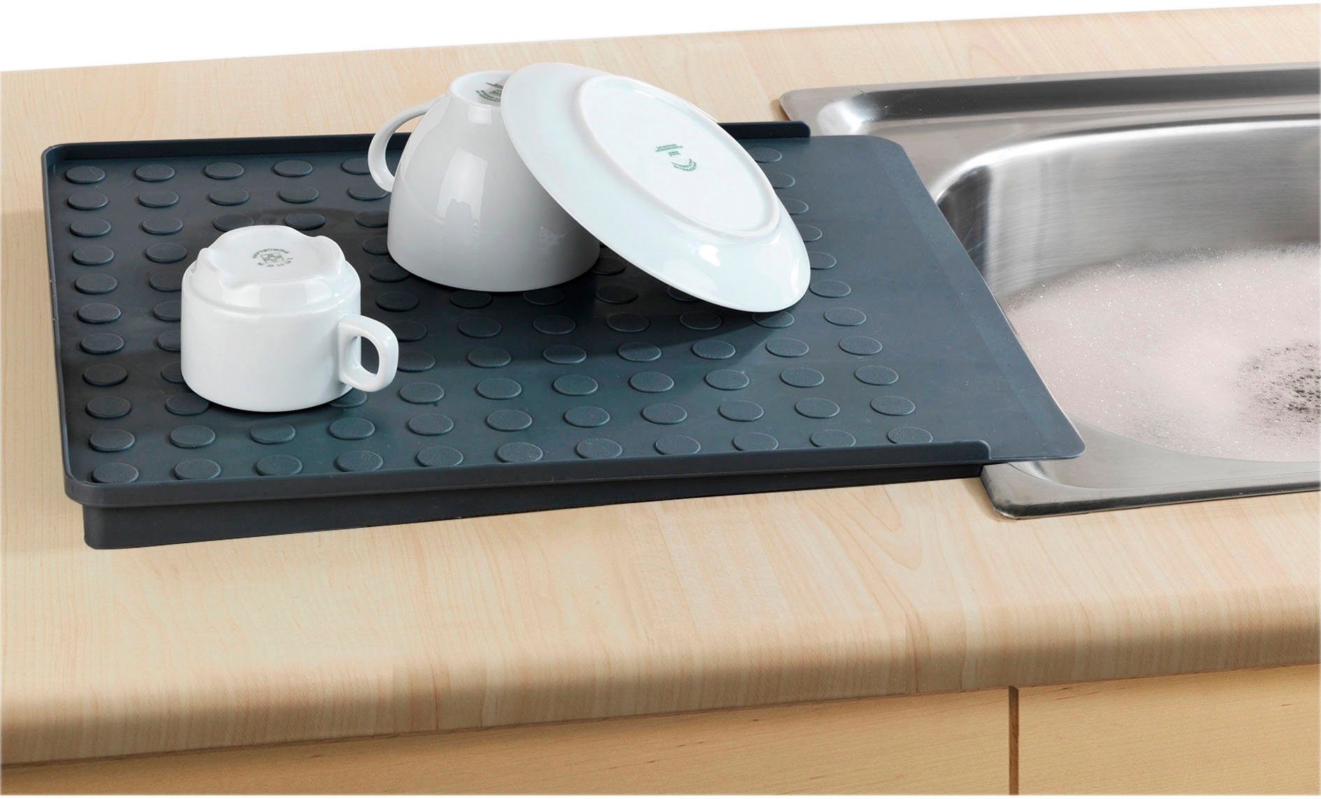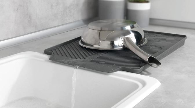Endlich keine Pfützen mehr in der Küche! Diese geniale Silikon-Abtropfmatte leitet Wasser mit ihrem speziellen Design direkt in die Spüle ab. Mit 40cm perfekte Größe für die meisten Arbeitsplatten. Auslaufsicher und rutschfest - schützt deine Arbeitsfläche vor Feuchtigkeit und Hitze. Super flexibel - kannst sie einfach zusammenfalten und platzsparend verstauen. Spülmaschinenfest und leicht zu reinigen. Funktioniert auch als Untersetzer für Töpfe oder Schneidebretter. Ein echter Küchen-Allrounder!