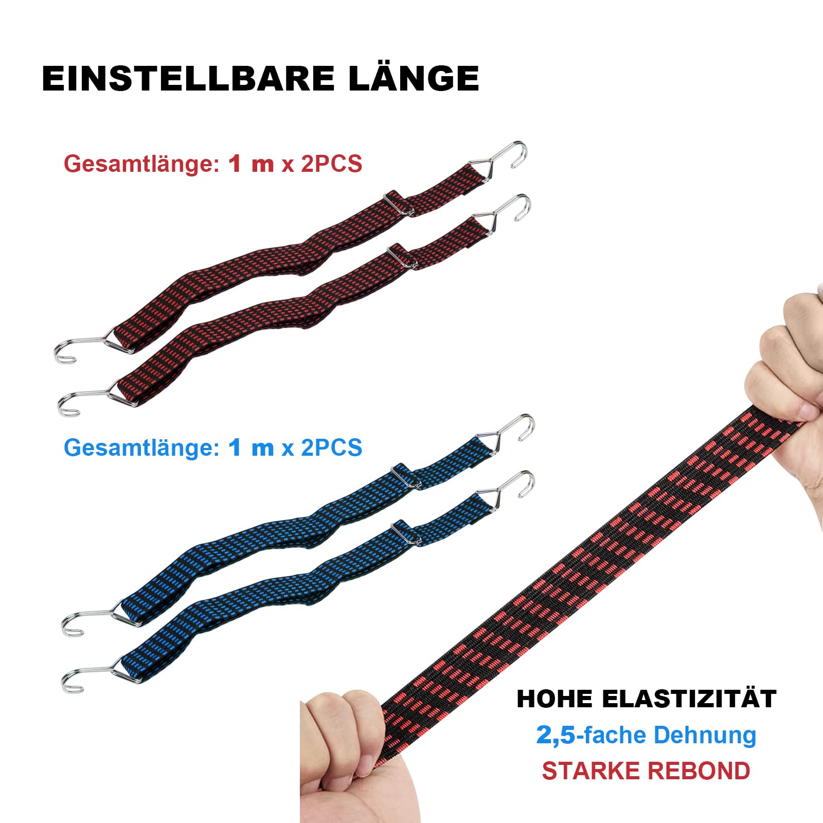 Die Gummiseile sind doppelt ummantelt - innen Latex für Elastizität, außen Polyester für Strapazierfähigkeit. Die Haken schonen die Oberflächen und halten bombenfest.