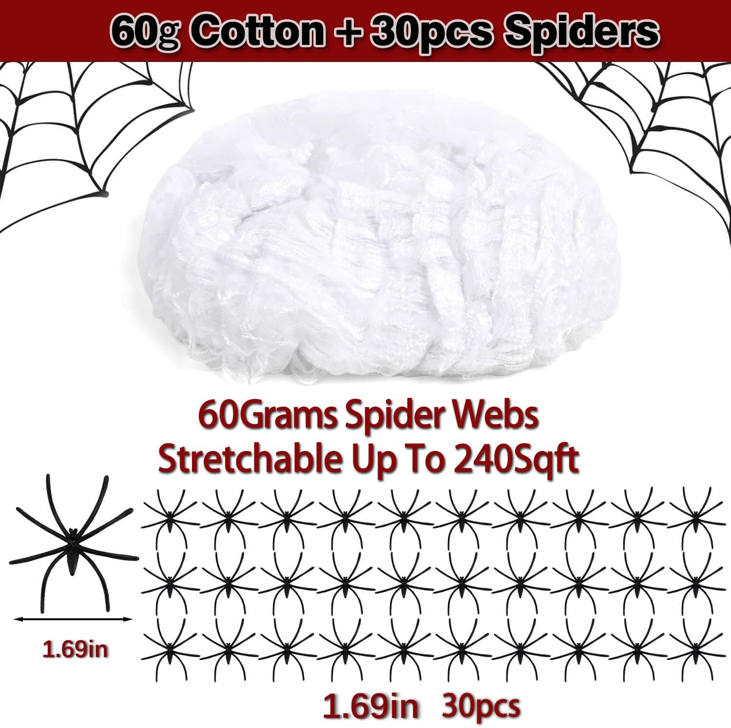 210g Spinnweben - dehnbar bis zum Zehnfachen! Sieht ultra-realistisch aus und bedeckt große Flächen. Dazu 60 gruselige Spinnen!