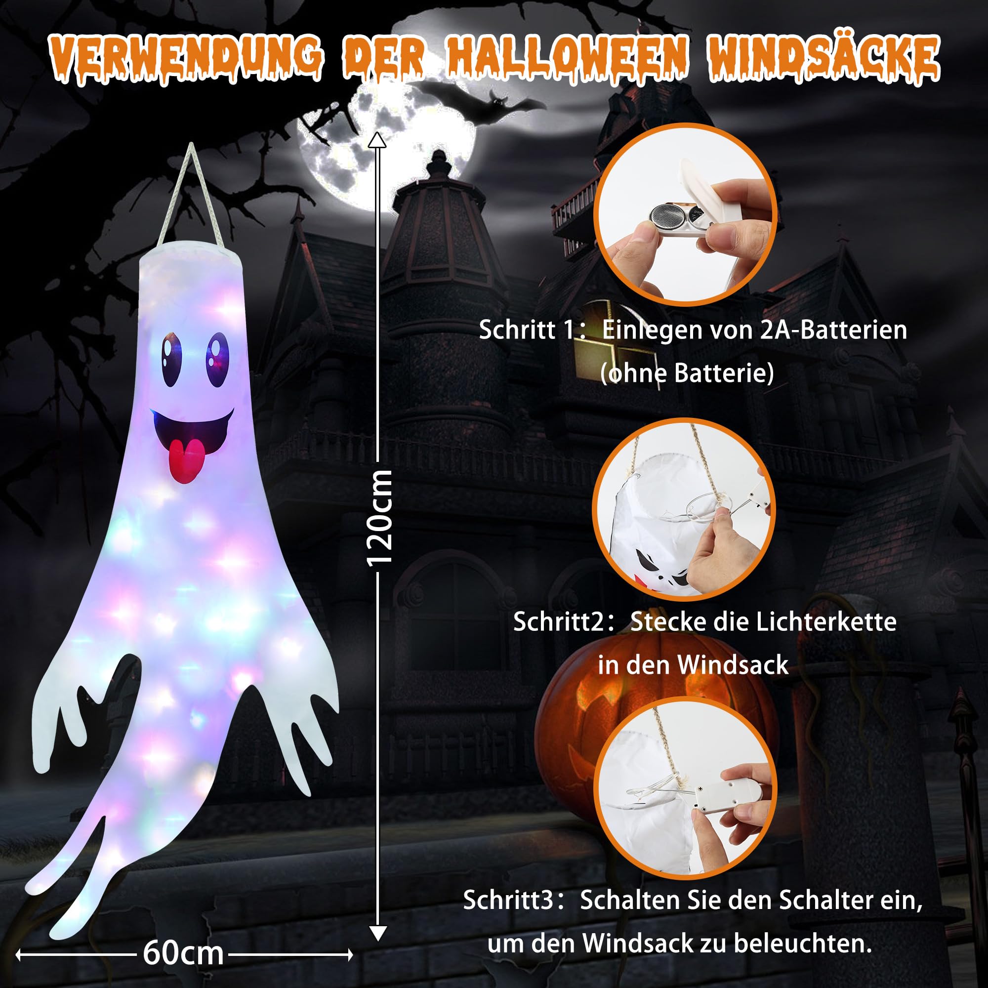 Mach dein Haus zur Gruselburg! Diese leuchtenden Geister-Kronleuchter sorgen für perfekte Halloween-Stimmung. Die Geister aus leichtem Polyester flattern gruselig im Wind und die LED-Lichter machen sie nachts richtig unheimlich.