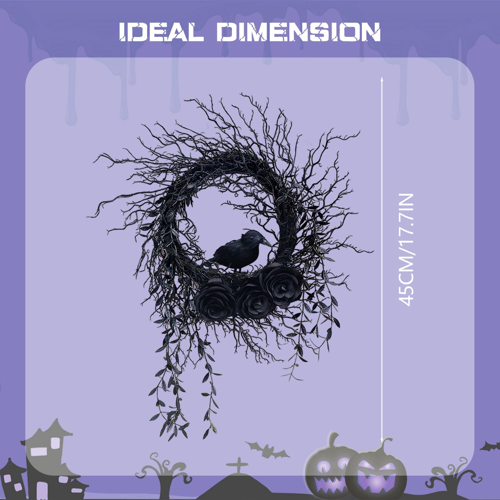 Boo! Dieser Halloween Krähenkranz bringt die richtige Grusel-Atmosphäre zu dir nach Hause. Mit 45 cm Durchmesser ist er ein echter Hingucker an deiner Tür oder Wand. Die schwarzen Toten-Zweige, Blätter und die gruselige Krähe in der Mitte sorgen für perfekte Halloween-Stimmung. Aus hochwertigem Kunststoff gefertigt - witterungsbeständig und mehrfach verwendbar. Einfach aufhängen (Haken nicht im Lieferumfang) und schon verwandelst du deinen Eingang in eine Horror-Kulisse. Perfekt für Halloween-Partys, als Deko im Garten, auf der Terrasse oder im Flur. Auch als Geschenk für Halloween-Fans super geeignet. Die realistische Krähe sieht einfach fies aus - genau das Richtige für eine gruselige Nacht! Ob alleine oder kombiniert mit anderen Halloween-Dekorationen - dieser Kranz macht einfach was her. Einfach aufhängen und dich von den Nachbarn beneiden lassen! Perfect für alle, die es richtig schön schaurig mögen.