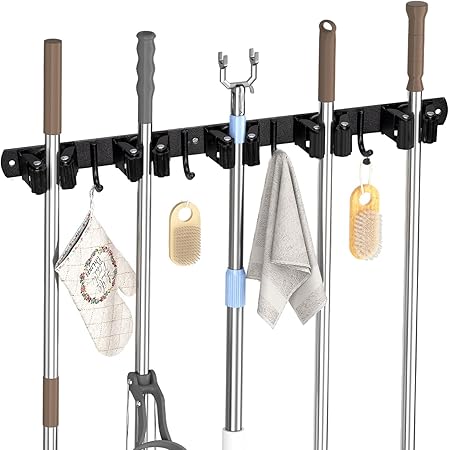 Endlich Ordnung mit dieser Besenhalterung von Cheerhom! Aus rostfreiem Edelstahl 304 - hält ewig! Mit 5 Haltern für Besen, Mopps & Co (Griffdurchmesser 19-30mm) und 4 zusätzlichen Haken für Kleinkram. Zwei Montagearten: Schrauben (bis 15kg) oder Kleben (bis 2,5kg). Die rutschfesten Silikon-Einlagen halten alles sicher. Super platzsparend an Wand in Küche, Bad, Garage oder Garten. Einfach einklicken - die Halter passen sich automatisch an! Nie wieder umgefallene Besen oder Chaos. Macht jede Ecke ordentlich und gibt dir mehr Platz - genial!