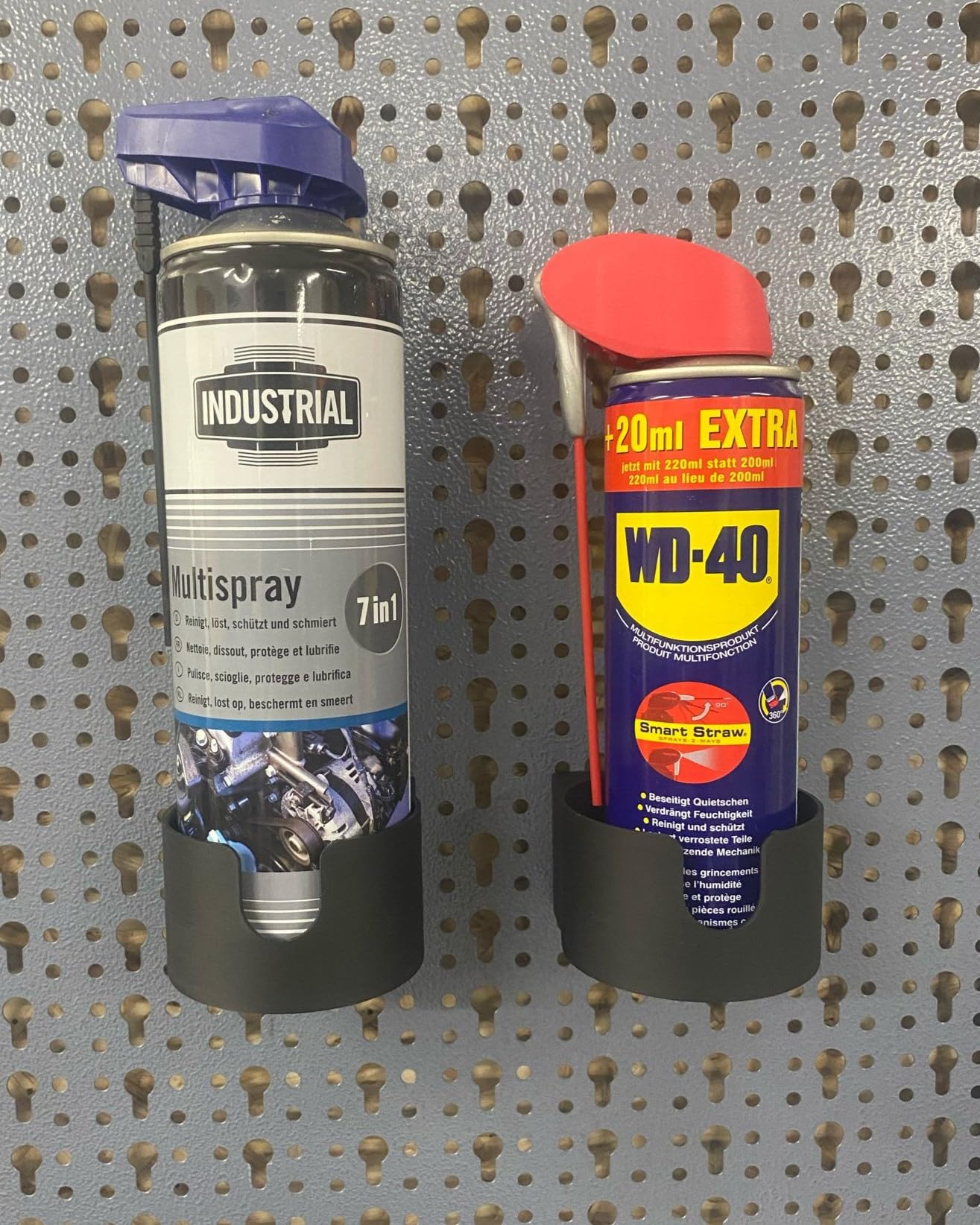 Endlich Ordnung für deine Sprühdosen! Diese praktischen Halterungen für Lochwände halten bis zu 3 Dosen pro Ablage sicher fest. Maximaler Durchmesser 70mm - passt für die meisten handelsüblichen Spraydosen. Lochabstand verstellbar von 37,5mm auf 45mm - einfach über die Schrauben auf der Rückseite anpassen. Kompatibel mit Küpper Lochwänden und allen anderen mit 45mm Eurolochung wie Kreher, Arebos, Tectake, Tegometall, Ondis und vielen mehr. Einfache Montage - einfach in die Schlüssellöcher einhängen, kein Abbau der Lochwand nötig! Super stabiler Halt, nichts verrutscht mehr. Made in Germany - Qualität die überzeugt. Im Set: 2x Ablagen für insgesamt 6 Sprühdosen. Mach deine Werkstatt oder Garage endlich richtig ordentlich - alles griffbereit und übersichtlich. Ein echter Game-Changer für jeden Heimwerker!