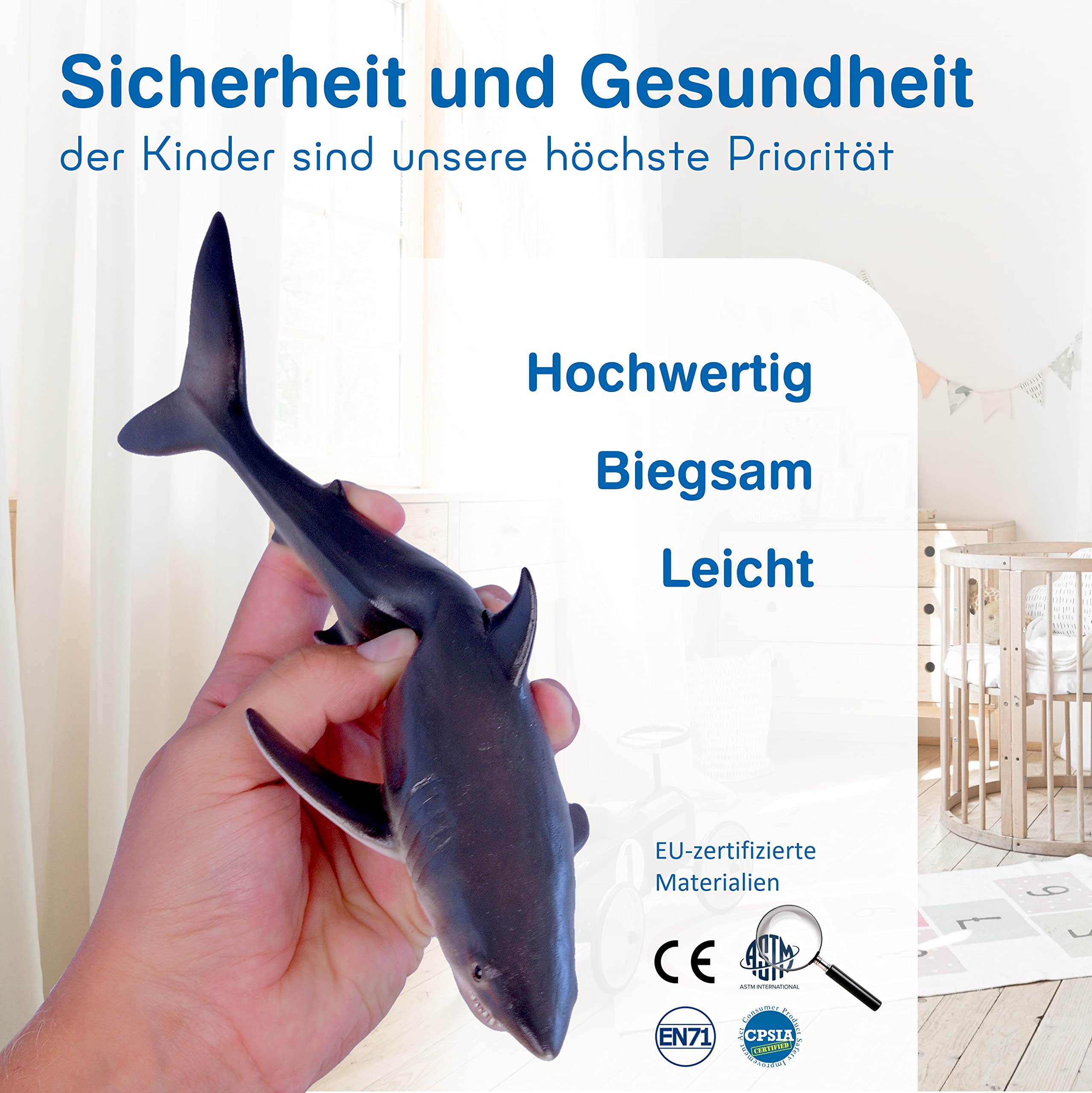 Dieser Hammerhai ist der Hit für kleine Meeresforscher! Mit 27cm Länge wirklich imposant, aber trotzdem leicht und biegsam - perfekt für Kinderhände. Liebevoll handbemalt mit vielen Details, wirkt total lebensecht. Aus weichem, CE-zertifiziertem PVC, sicher für Kinder ab 3 Jahren. Schwanz und Flossen sind beweglich für noch mehr Spielspaß. Inklusive eBook-Geschichte über Meeresabenteuer. Perfekt für die Badewanne, den Sandkasten oder einfach zum Sammeln. Ein tolles Geschenk für alle Haifans!