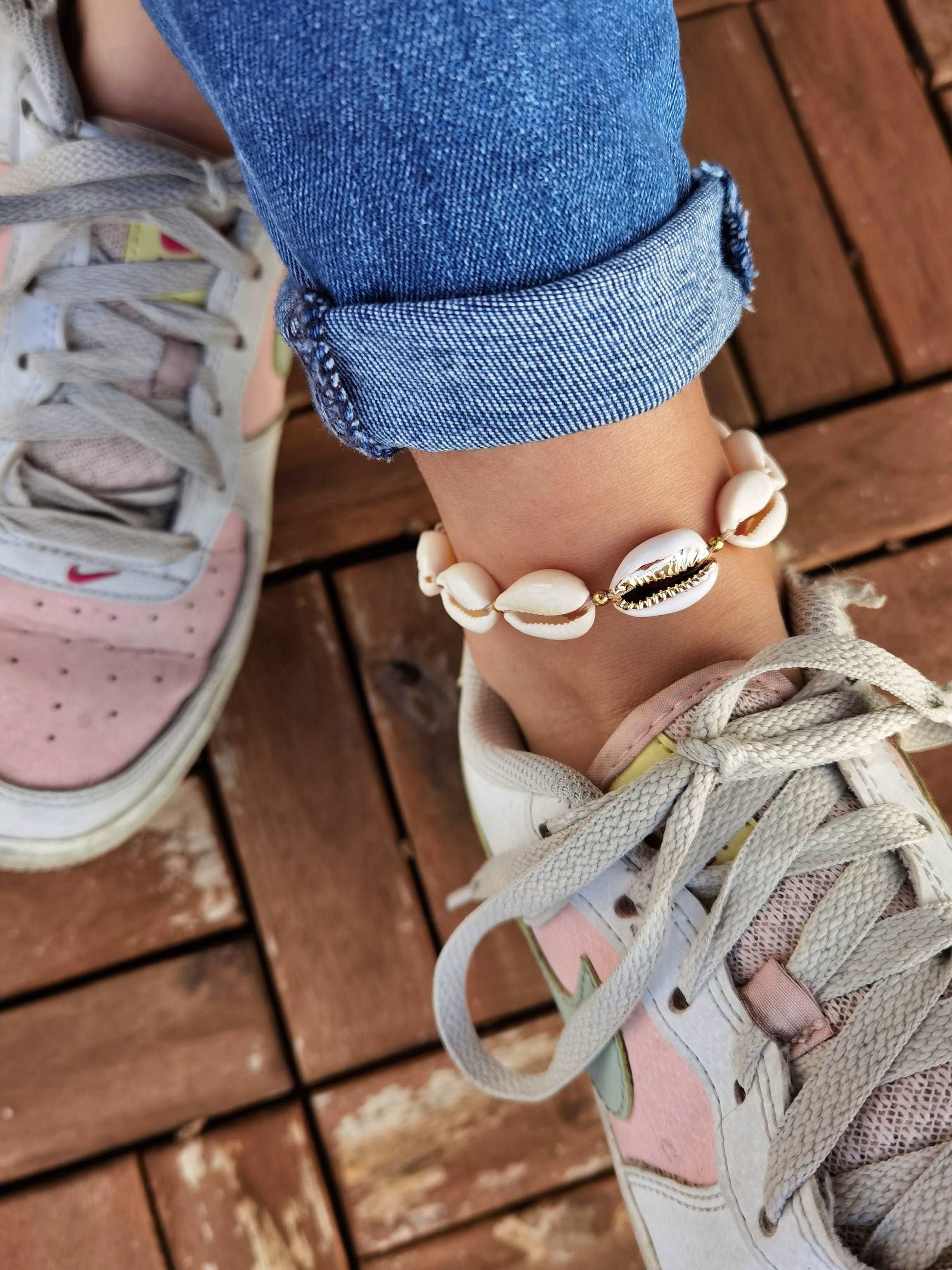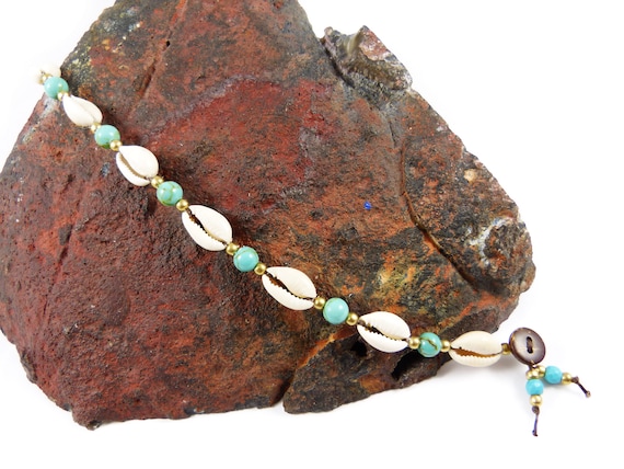 Suchst du ein besonderes Accessoire, das nicht jeder hat? Dieses handgeflochtene Fußkettchen ist genau das Richtige! Hergestellt in Thailand im typischen Boho-Stil, mit natürlichen Kauri-Muscheln und Türkis-Perlen. Das gewachste Baumwollgarn ist super robust, liegt weich auf der Haut und ist sogar wasserfest - du kannst es also auch mal am Strand tragen, ohne dass was passiert. Verschlossen wird es mit einem süßen Kokos-Knopf, verziert mit kleinen Perlen-Anhängern. Das Tolle: Mit der Zeit wird das Band noch weicher und passt sich perfekt deinem Fuß an. Du kannst es jeden Tag tragen, ob zu Jeans, Kleid oder Shorts - es passt einfach immer! Und wenn du eine andere Größe brauchst, kein Problem: Einfach bei der Bestellung angeben, Standard ist 23 cm Umfang. So ein Unikat ist auch ein super Geschenk für Freundinnen oder Familienmitglieder, die was Besonderes mögen. Einfach umschnallen und den sommerlichen, lässigen Look genießen - damit ziehst du garantiert Blicke auf dich!