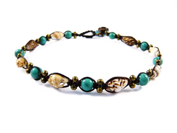 Handgeflochtenes Fußkettchen Mit Kauri Muscheln & Türkis - Boho Style Aus Thailand