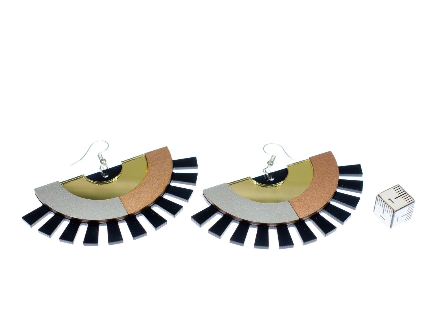 Absolute Hingucker aus Berlin! Diese handgefertigten Ethno-Ohrringe mit Halbkreis-Design sind einfach mega stylisch. Aus Acrylglas mit metallischem Glanz und schwarzen Strahlen - total besonders. Mit 70mm Länge (ohne Haken) und versilberten Ösen. Perfekt für Allergiker geeignet. Ob für Party, Festival oder täglichen Style - damit fällst du auf! Handmade in Berlin - da steckt Liebe drin. Einfach anziehen und glänzen - mehr Individualität für deinen Look! Super als Geschenk für besondere Anlässe.