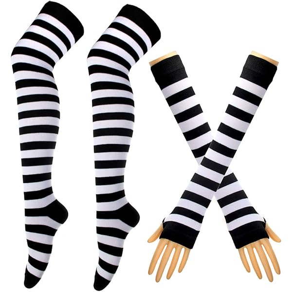 Perfekt für Cosplay, Halloween oder Partys! Dieses Set enthält 1 Paar gestreifte Overknee-Strümpfe (50cm lang) und 1 Paar fingerlose Handschuhe (31cm lang). Aus weicher Poly-Baumwoll-Mischung, die atmungsaktiv und hautfreundlich ist. Hohe Elastizität für optimale Passform bei verschiedenen Körpergrößen. Die dicken Strümpfe halten dich an kühlen Tagen warm, während das stylische Streifendesign für Aufmerksamkeit sorgt. Einheitsgröße für alle - einfach überziehbar und sofort bereit für deinen nächsten Auftritt!