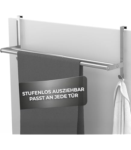 Perfekt für alle, die keine Löcher in die Wand bohren wollen! Dieser TAILI Handtuchhalter mit 5 Haken hält bombenfest mit Saugnapf-Technologie - bis zu 10 kg Last! Einfach anschieben, Luft rauslassen und fertig - keine Werkzeuge nötig. Lässt sich von 12 auf 24 Zoll verlängern, super flexibel. Aus robustem ABS-Material, rostfrei und wasserfest - ideal für feuchte Badezimmer. Die 5 Haken gleiten smooth und zerkratzen nichts. Hält auf glatten Oberflächen wie Fliesen, Glas, Metall. Einfach zu reinigen und umzupositionieren - perfekt für Mieter! Mach dein Bad ordentlicher, ohne die Wand zu ruinieren. Einfach genial!