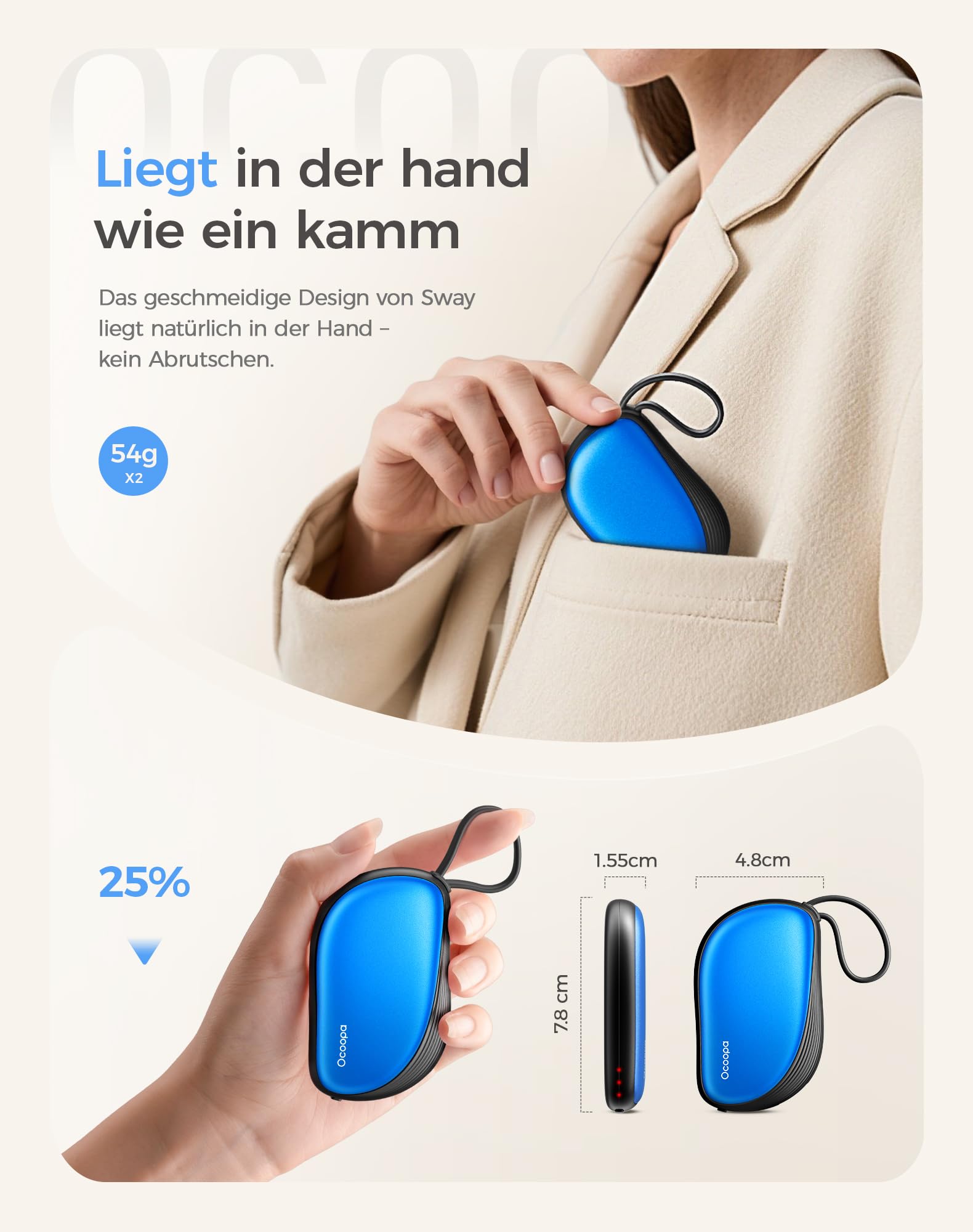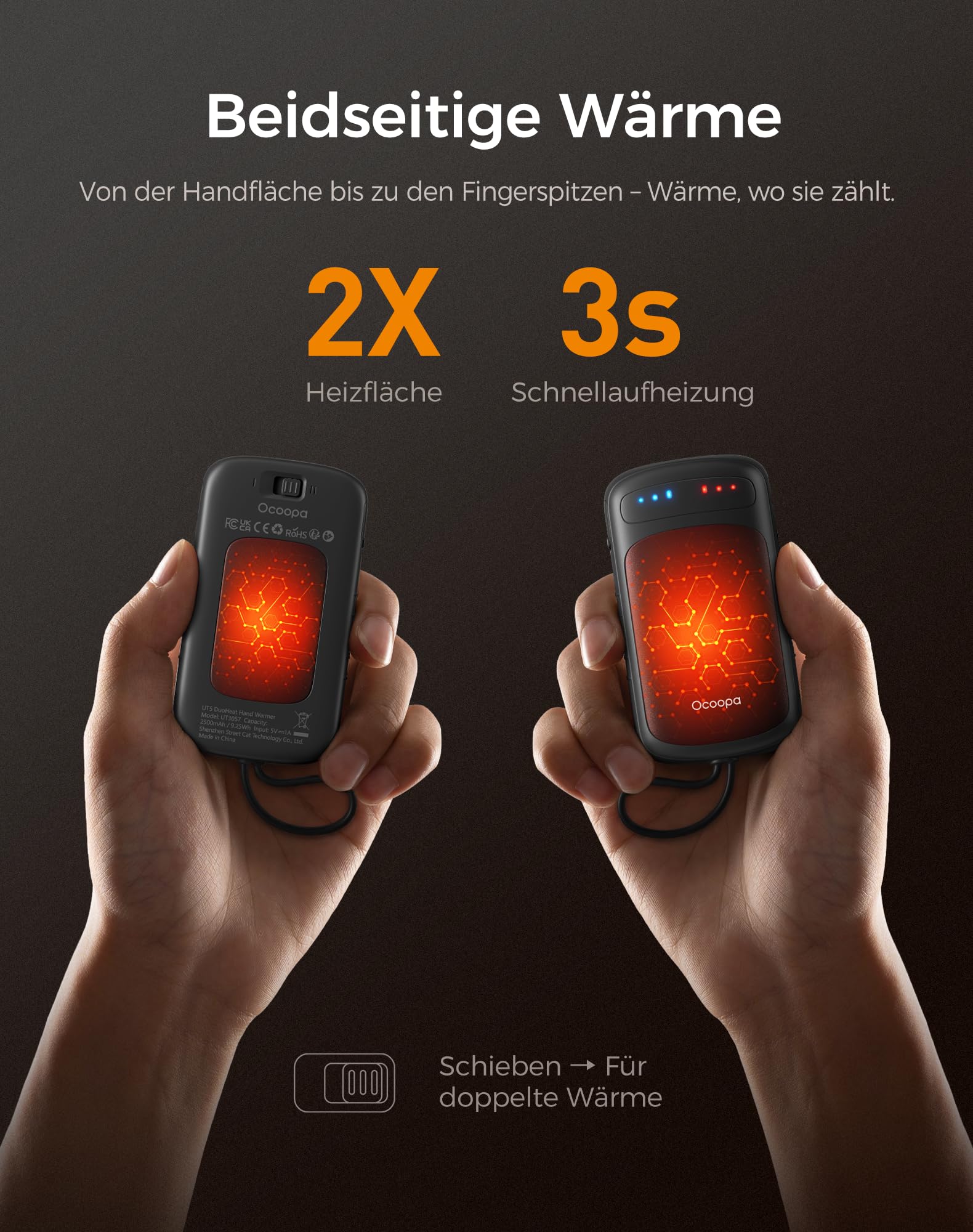 Brrr, bei der Kälte sind diese Handwärmer dein bester Freund! Das 2er-Pack von OCOOPA heizt in nur 3 Sekunden auf und hält bis zu 6 Stunden warm. Mit 4000mAh Akku und 3 Heizstufen - du bestimmst wie warm es sein soll. Nur 1,55cm dünn und 54g leicht - passt in jede Tasche oder sogar in Handschuhe. Das elegante Kamm-Design sieht super stylisch aus. Perfekt für Ski, Wandern, Pendeln oder einfach für unterwegs. Mit USB-C aufladbar - also wiederverwendbar und umweltfreundlich. Ein ideales Geschenk für Weihnachten oder einfach für dich selbst. Damit überstehst du jeden Wintertag in warmen Händen!