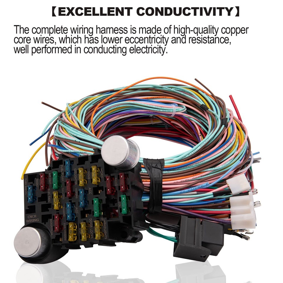 Für alle Auto-Bastler und Restaurations-Projekte: Dieser 21-Schaltkreis-Kabelbaum ist universell einsetzbar und hat extra lange Kabel - passt in fast jedes Fahrzeug! Speziell kompatibel mit GM und Chevy Modellen, inklusive GM-Säulenverbinder. Alle Kabel sind alle 12,7cm beschriftet und farbcodiert nach GM-Standard - die Installation wird so super einfach. Enthaltene Schaltkreise: Scheibenwischer/Radio, Cruise/Backup, Heizung/Luft, Uhr, Kuppel, Zigarettenanzünder und vieles mehr. Mit 17 Sicherungen für maximale Sicherheit. Professionelle Installation wird empfohlen - die Montageanleitung ist per E-Mail verfügbar. Perfekt für Hotrods, Oldtimer oder komplette Neuverkabelungen. Mach dein Projekt auto mit diesem hochwertigen Kabelbaum-Set!
