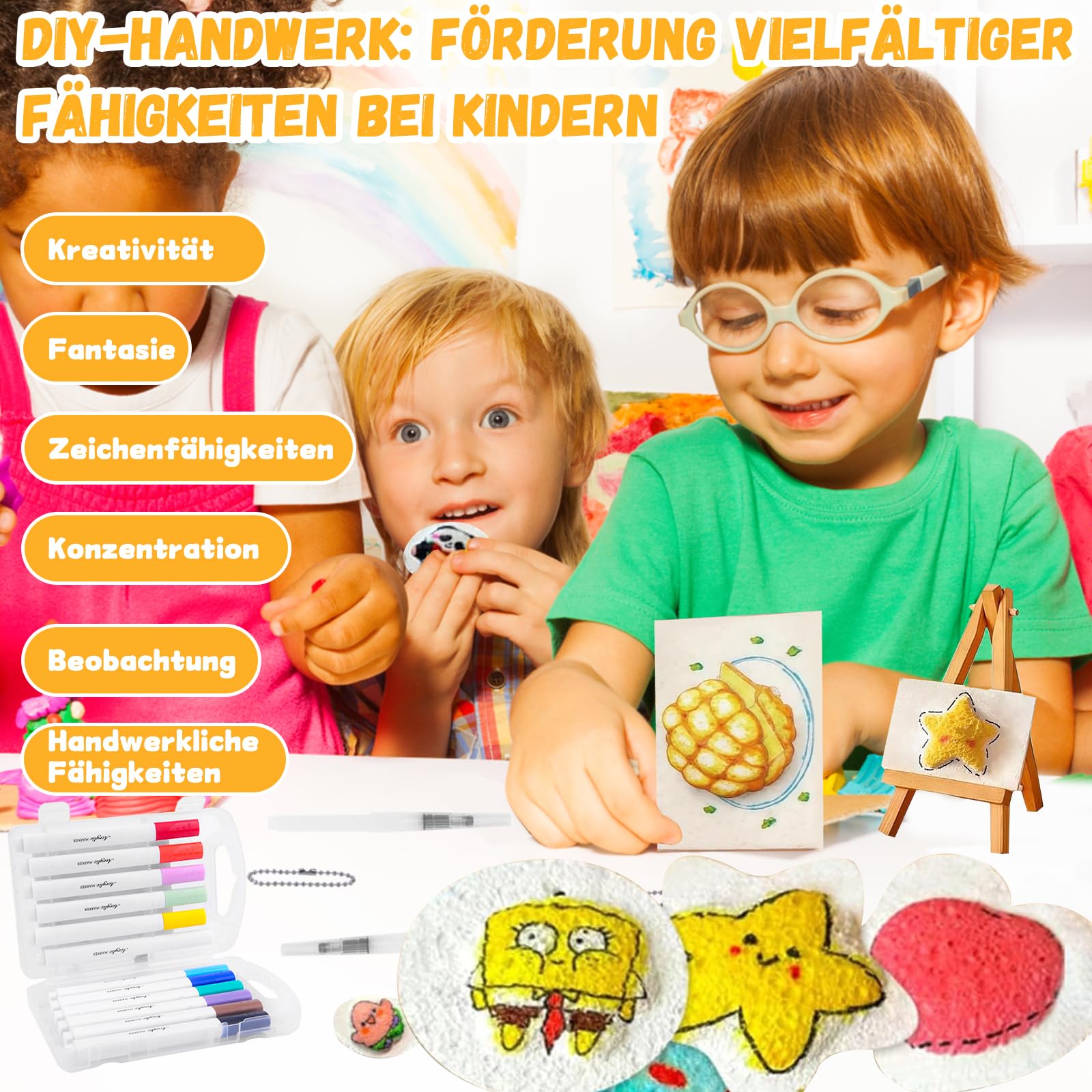 Wow, dieses Magic Puffy Paint Set macht Malen zum echten Erlebnis! Mit den 12 speziellen Stiften malst du auf die mitgelieferten Leinwände und siehst wie deine Kunstwerke magisch aufquellen und 3D-Effekte bekommen - einfach nur mit Wasser aktivieren! Im Set findest du alles, was kleine Künstler brauchen: 12 bunte Marker, verschiedene Papierformen (Rechtecke, Quadrate, Kreise), eine Staffelei, Pinsel mit Wassertank, Aufkleber und sogar Ketten zum Aufhängen der Kunstwerke. Perfekt für Kindergeburtstage, Regentage oder einfach als kreative Beschäftigung. Die Materialien sind komplett ungiftig und sicher für Kinder. Einfach auspacken und loslegen - der Kreativität sind keine Grenzen gesetzt! Das Set kommt in einer praktischen Aufbewahrungsbox, sodass alles ordentlich verstaut werden kann.