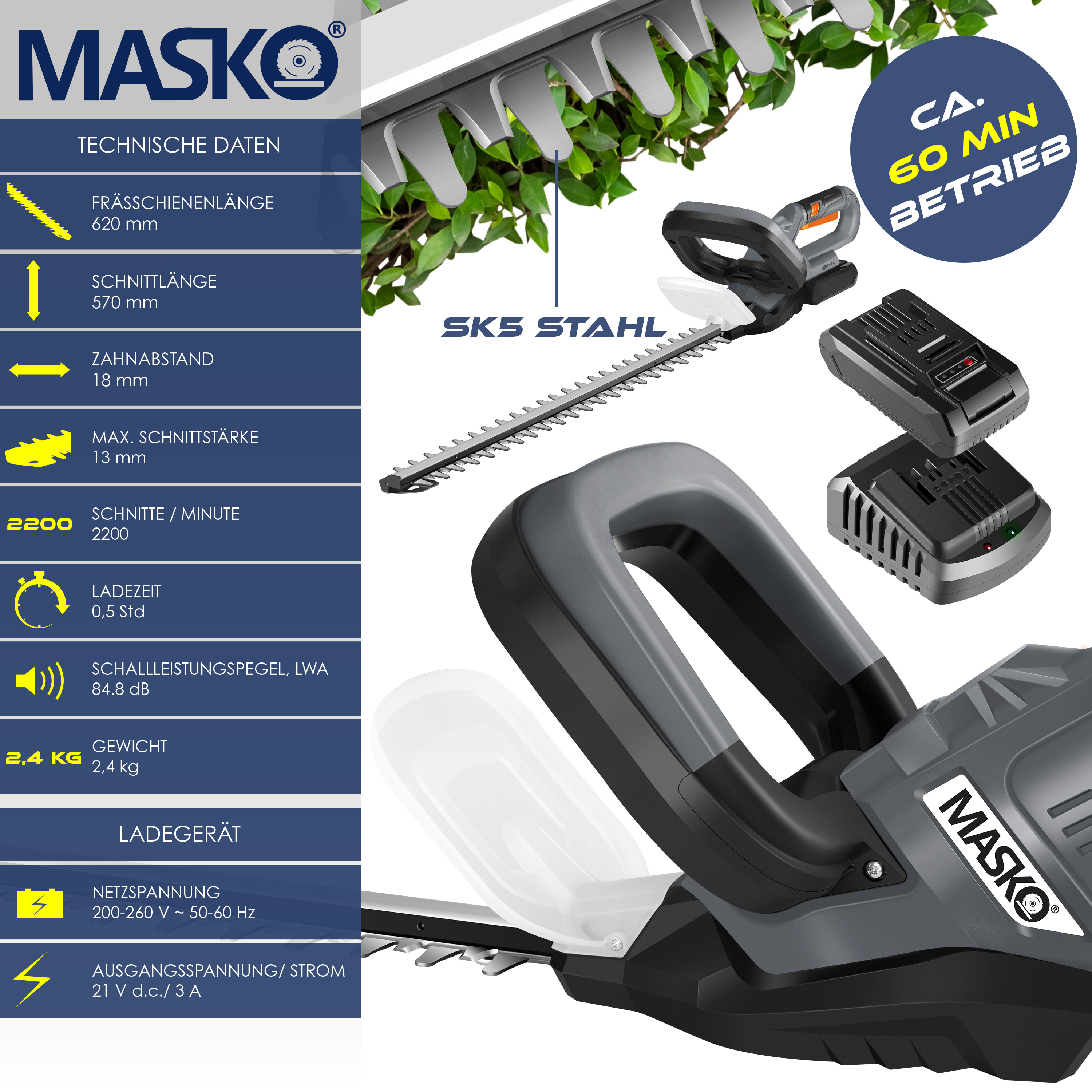 LUX-TOOLS Akku-Heckenschere 20V - 52cm Schnittlänge Mit Akku & Ladegerät