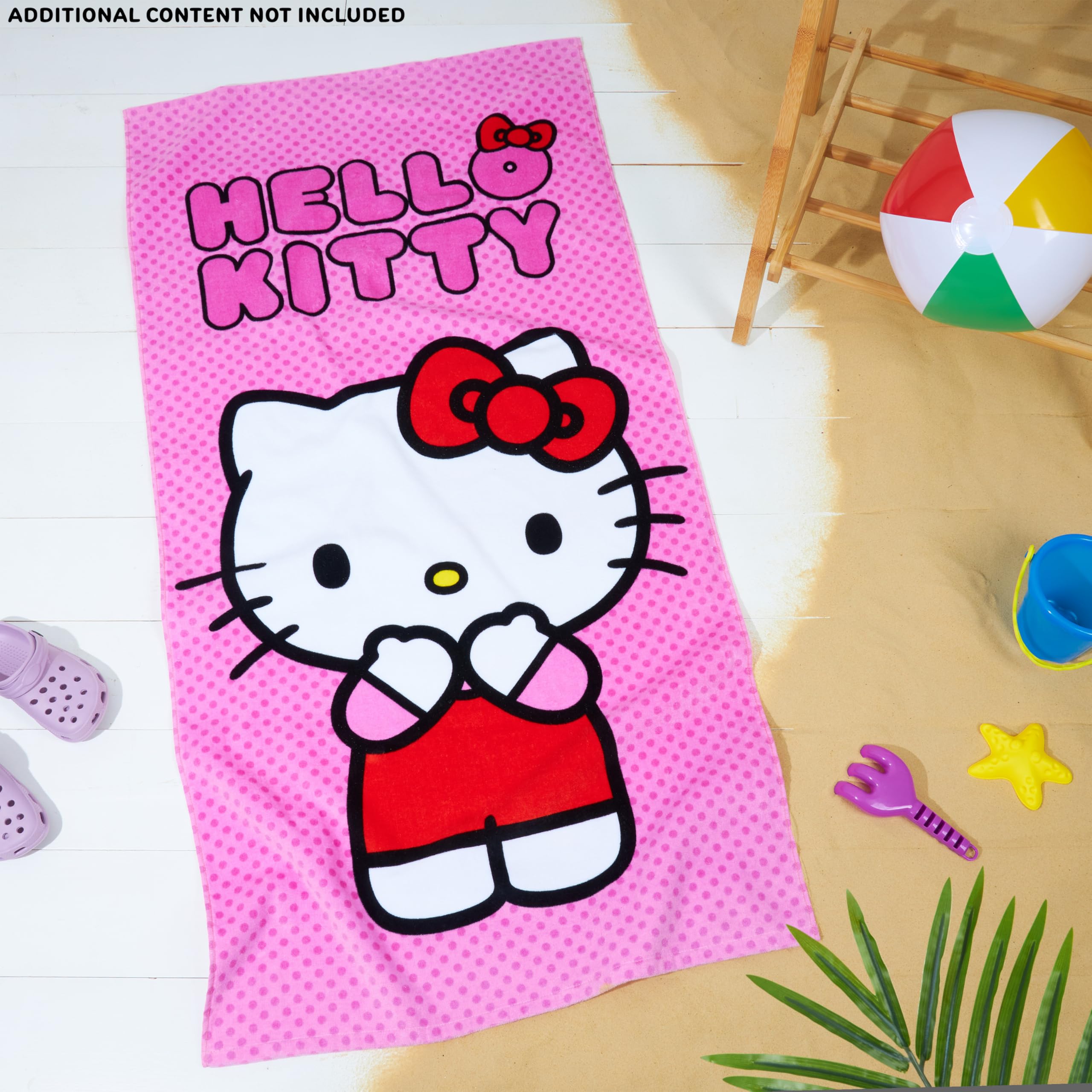 Hello Kitty Fan? Dieses entzückende Strandtuch ist ein Muss für alle kleinen und großen Fans! Aus 100% weichem Baumwoll-Frottee, super saugfähig und hautfreundlich. Mit 70x140 cm groß genug zum Einwickeln nach dem Schwimmen, aber leicht genug für unterwegs. Der niedliche Hello Kitty Print in Rosa bringt Kinderaugen zum Leuchten. Perfekt für Strand, Pool, Badezimmer oder als Kuscheltuch. Die lebendigen Farben bleiben auch nach häufigem Waschen schön. Ein ideales Geschenk für Geburtstage, Weihnachten oder einfach so. Mach jeden Tag zu einem Hello Kitty Tag!