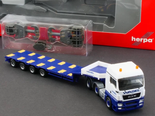 Wie im echten Leben wird der Kran von der Schwerlastspedition Wasel transportiert. Jedes Detail ist liebevoll umgesetzt - von der lackierten Karosserie bis zur realistischen Bedruckung.