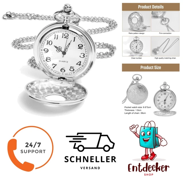 Zeitlos elegant! Diese wunderschöne Taschenuhr im Vintage-Design ist das perfekte Accessoire für den modernen Gentleman. Mit ihrem arabischen Zifferblatt und den detailverliebten Zahnrad-Motiven samt Krone strahlt sie pure Männlichkeit aus. Die Bronze-optik aus hochwertiger Metalllegierung behält auch bei täglicher Nutzung ihren edlen Glanz. Im Lieferumfang ist eine komplette Halskette mit Taschenuhr und ein schicker Samtbeutel für die sichere Aufbewahrung enthalten. Perfektes Geschenk für Väter, Ehemänner oder Brüder zu Geburtstagen, Weihnachten oder anderen besonderen Anlässen. Die analoge Quarz-Uhrwerk sorgt für zuverlässige Zeitangabe. Ein klassisches Stück, das immer im Trend liegt und jeden Anzug oder jede Jeans aufwertet. Für den Mann, der Stil und Tradition zu schätzen weiß!