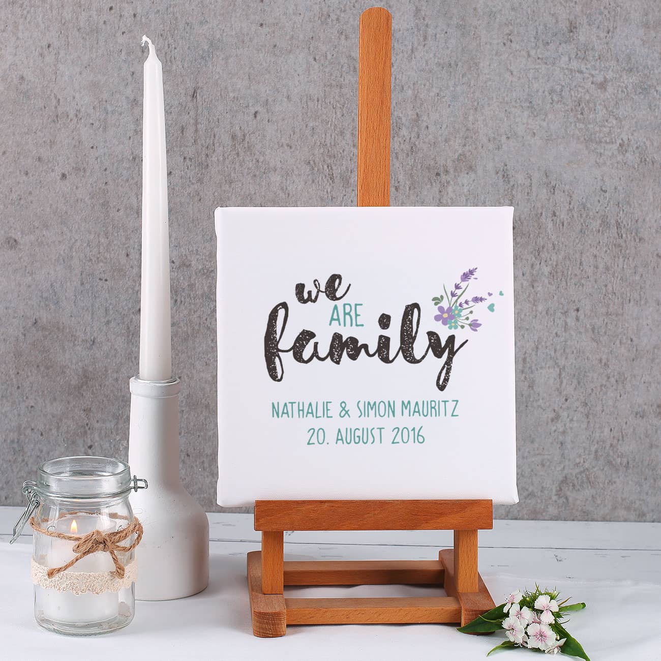 Wie süß ist denn diese Mini-Leinwand? Mit dem Spruch 'We are family' und eurem persönlichen Wunschtext wird sie zum absoluten Lieblingsstück. Perfect als Geschenk für Geburtstage, Weihnachten oder Muttertag - einfach individuell gestalten und Freude bereiten. Die 20x20cm große Leinwand ist genau die richtige Größe fürs Regal oder die Kommode. Aus hochwertigem Canvas auf Keilrahmen und mit UV-beständiger Farbe gedruckt, bleibt das Motiv lange schön. Einfach beim Kauf die beiden gewünschten Textzeilen angeben und schon wird eure persönliche Leinwand erstellt. Damit zeigt ihr eurer Familie, wie sehr ihr sie liebt - ein wirklich herzliches Geschenk das garantiert gut ankommt!
