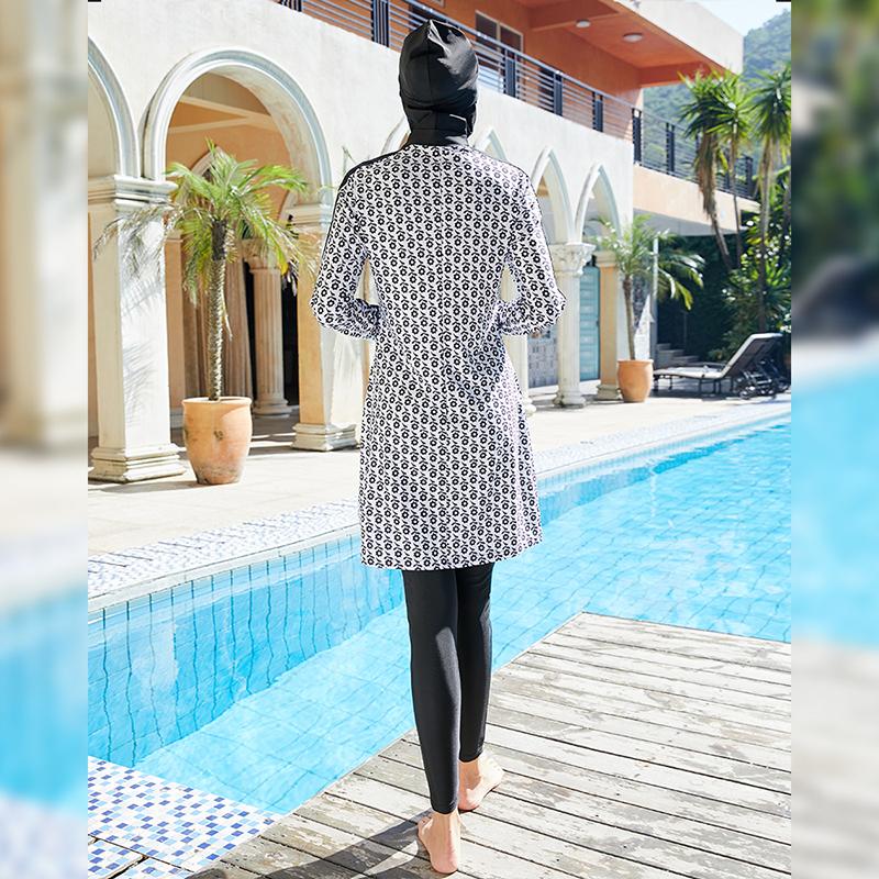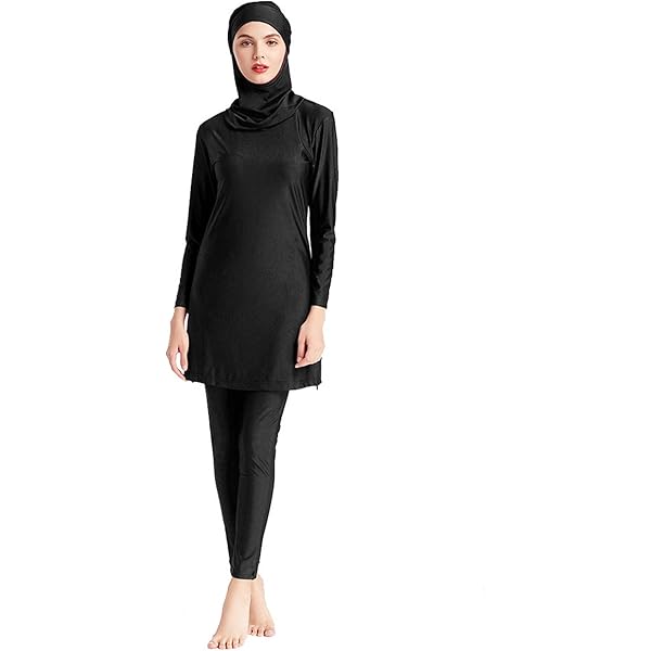 Du suchst eine Bademode, die sowohl deinen Glauben respektiert als auch sportlich funktional ist? Dieser 3-teilige Burkini ist perfekt! Das Set besteht aus einem langärmligen Oberteil, einer hochtaillierten Hose und einem passenden Hijab - alles aus schnelltrocknendem Material, das sich super angenehm tragen lässt. Beim Schwimmen, Tauchen oder Plantschen bleibst du stets bedeckt, ohne auf Bewegungsfreiheit verzichten zu müssen. Die elastischen Bündchen an Ärmeln und Beinen sorgen für sicheren Halt, und die hohe Taille gibt dir zusätzlichen Komfort. Egal ob im Schwimmbad, am See oder Meer - mit diesem Burkini genießt du das Wasser ohne Kompromisse. Einfach anziehen und ins Vergnügen springen!