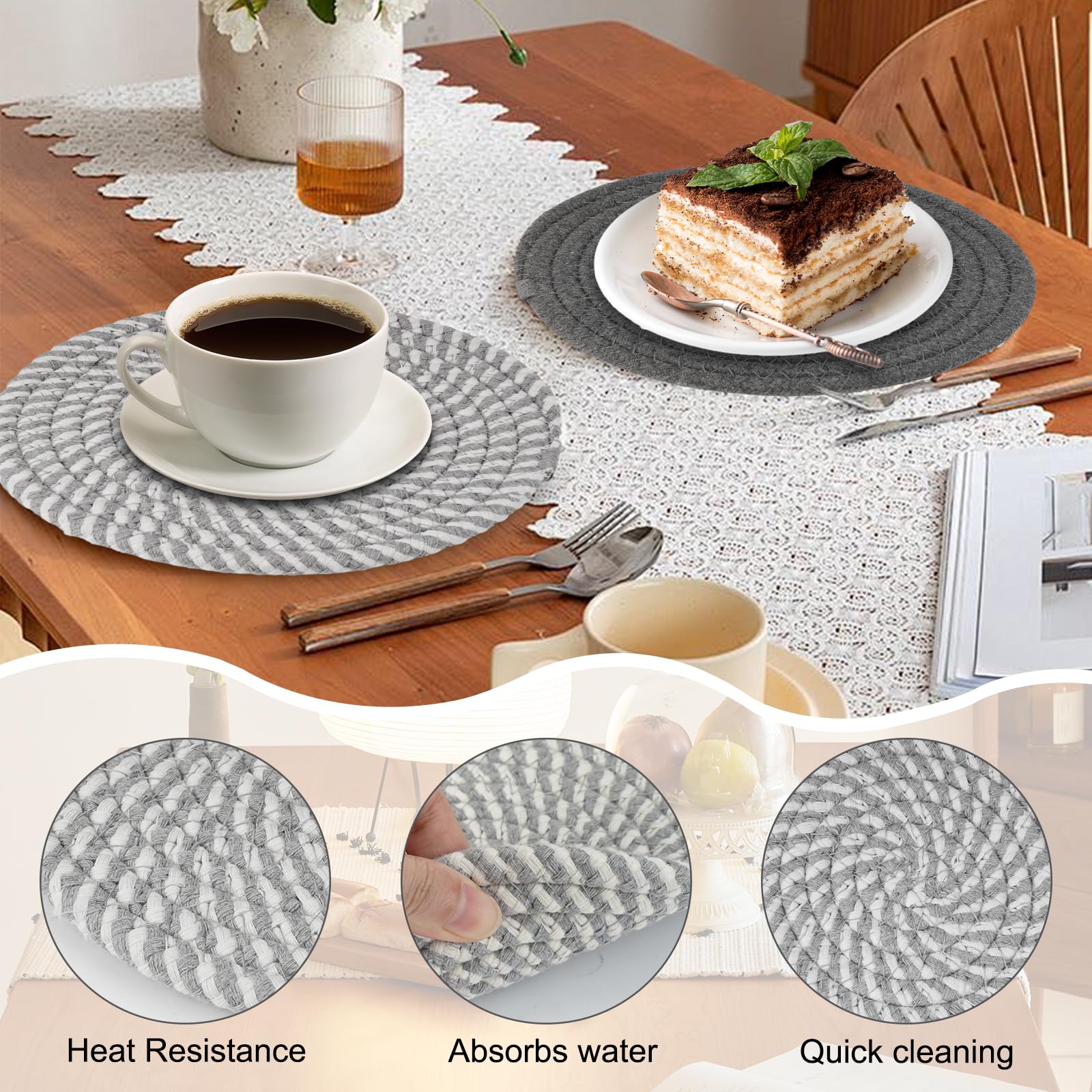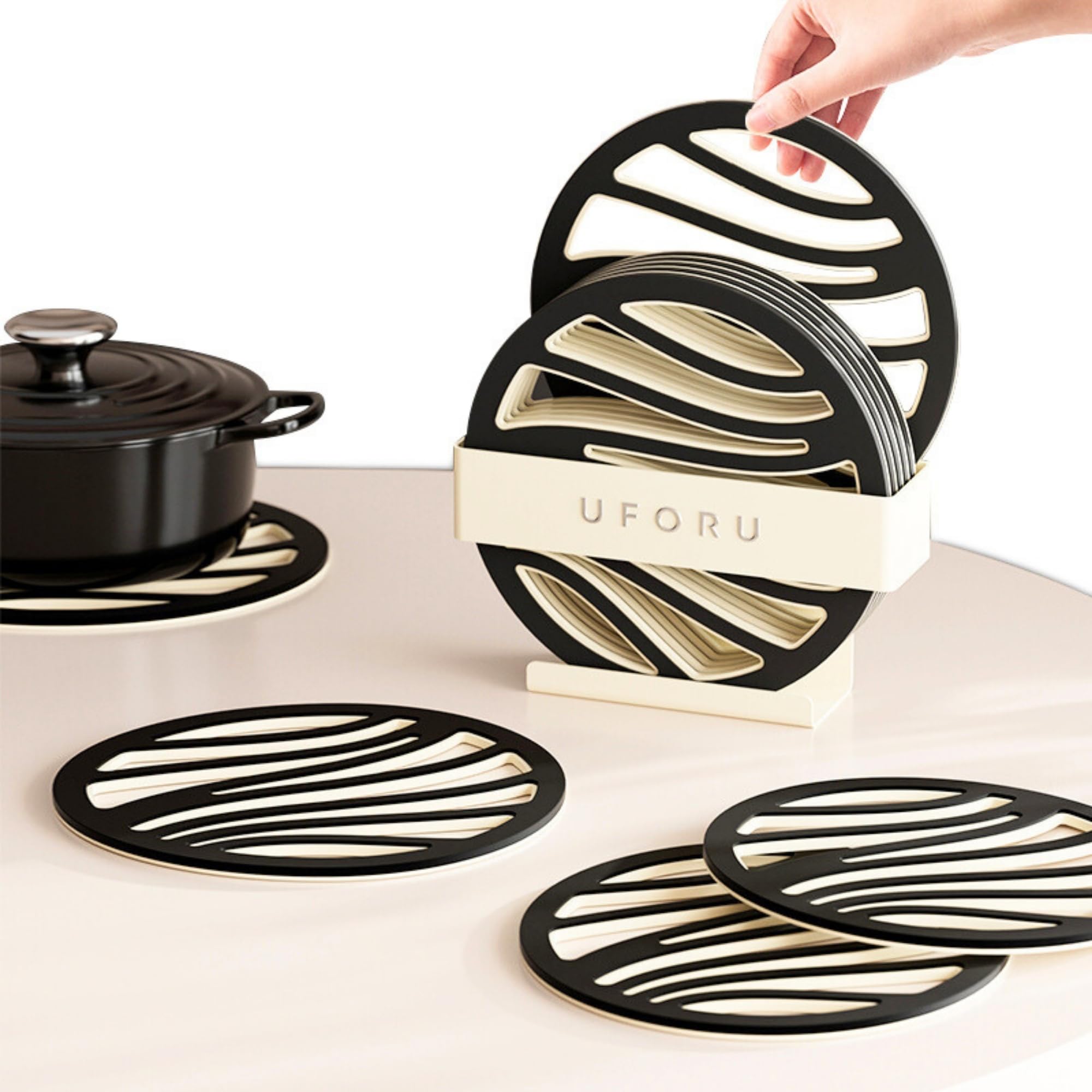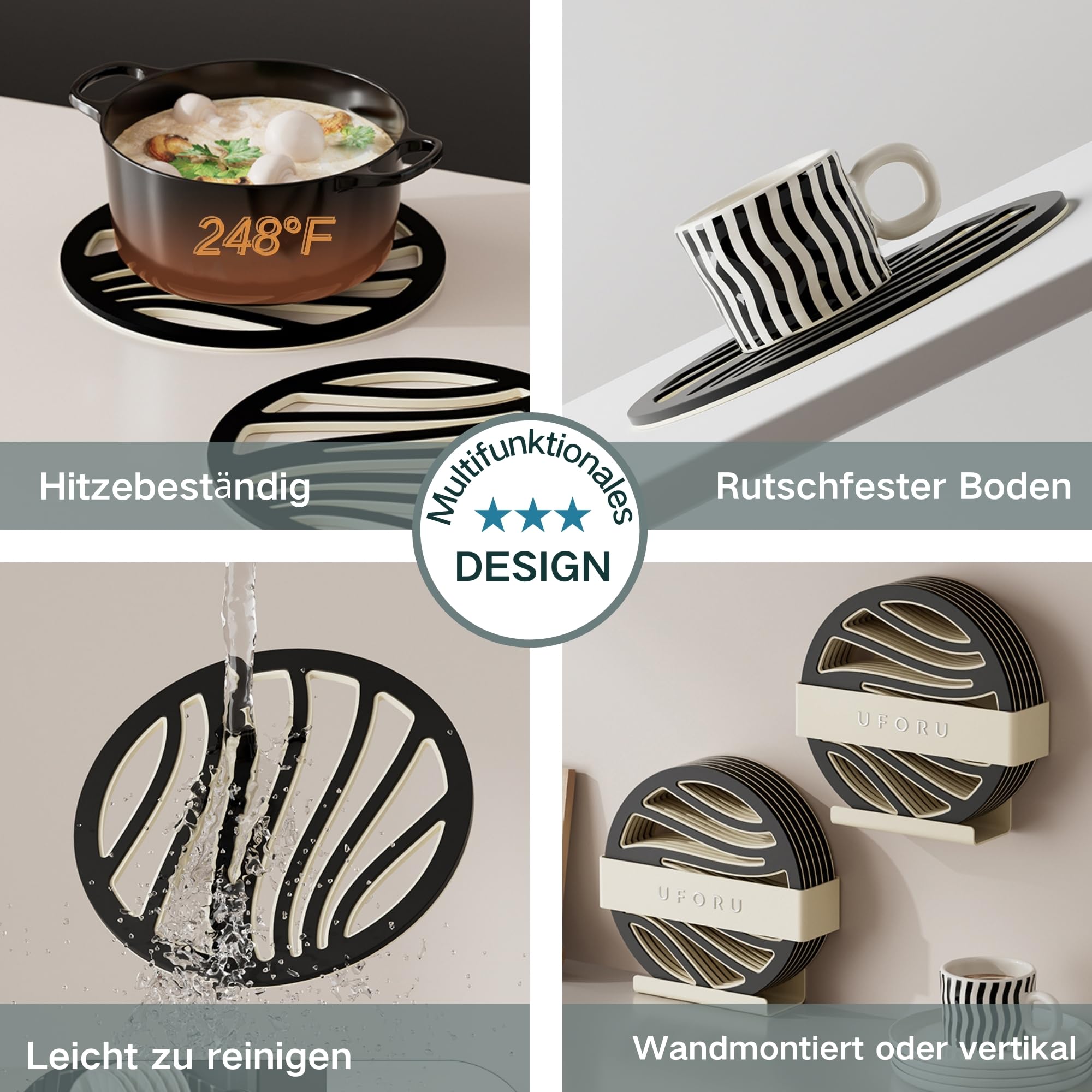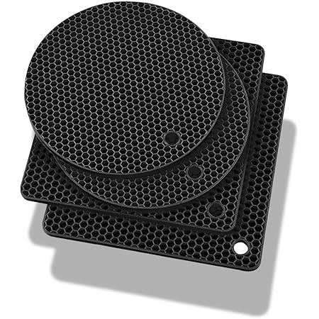 Schütze deine Möbel vor heißen Töpfen! Dieses 6er Set Topfuntersetzer von JanYoo ist der Retter für deine Küche. 15,5cm Durchmesser - passt zu allen Töpfen und Pfannen. Hitzebeständig bis 248°F (120°C) - absolut sicher. Aus PP- und TPE-Material - isoliert Hitze effektiv. Rutschfeste Oberfläche - Töpfe bleiben sicher stehen. Beidseitig verwendbar - auch als Wandhalterung montierbar. Inklusive praktischer Aufbewahrungsbasis - ordentlich verstaut. Leicht zu reinigen - einfach mit Wasser abwaschen (nicht spülmaschinenfest). Schützt Tische und Arbeitsplatten vor Kratzern und Hitzeschäden. Verlängert die Lebensdauer deiner Töpfe und Pfannen. Schwarz Farbe - dezent und passt in jede Küche. Praktisches Set für jeden Haushalt - immer griffbereit! Macht deine Küche sicherer und stylisher - einfach Topf drauf und entspannen!