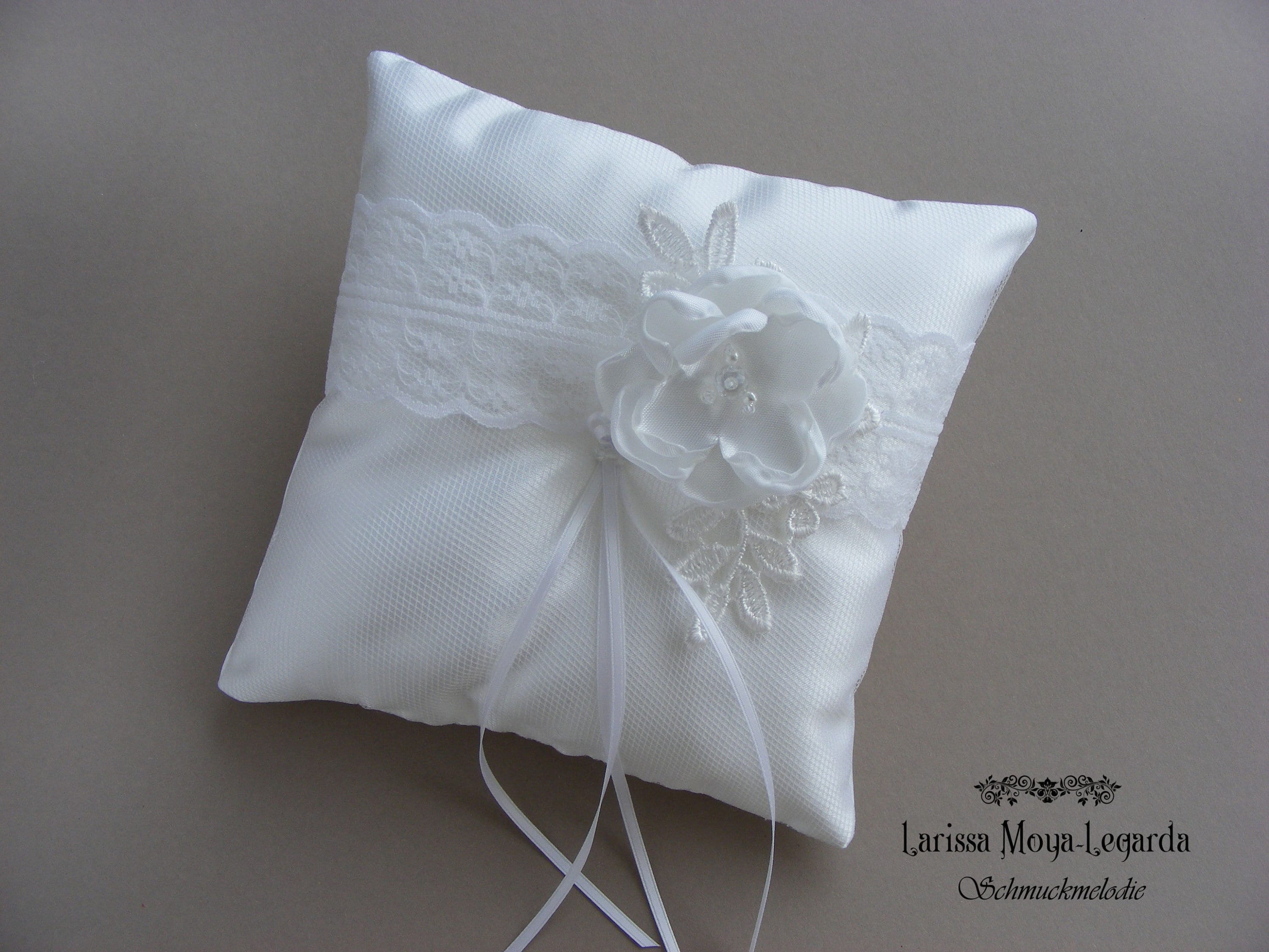 Wunderschönes Ringkissen für den großen Tag! Aus hochwertigem Satin und Polyesterband - zart und elegant. Mit liebevoller Bestickung, Spitze und Blumen-Verzierungen. Maße 20x20cm - handlich aber auffällig. In reinem Weiß - passt zu jedem Hochzeitsstil. Perfekt für Trauringe, aber auch für anderen Schmuck. Schafft eine romantische Atmosphäre bei der Trauung. Auch toll für Verlobungen oder Jubiläen. Ein besonderes Geschenk für Brautpaare - mit persönlicher Note. Macht die Ringübergabe zu einem unvergesslichen Moment. Einfach schön!
