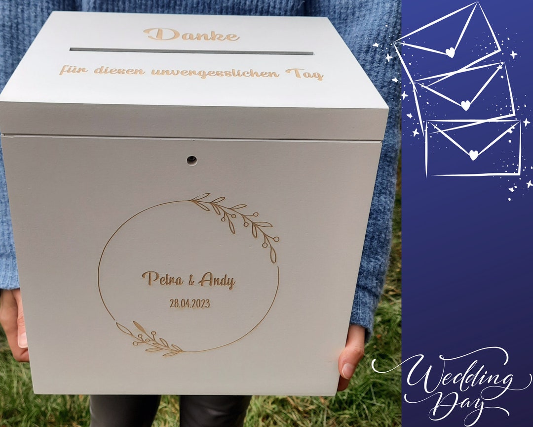 Die perfekte Box für eure Hochzeitsgeschenke! Mit 30x22x22 cm ist sie groß genug für alle Karten, Briefe und Geldgeschenke eurer Gäste. Der abnehmbare Deckel macht das Leeren super einfach, und der Schlitz ist genau richtig für Standard-Umschläge. Aus stabilem Karton, den ihr nach Belieben verzieren könnt - mit Blumen, Schleifen oder was auch immer zu eurem Motto passt. Nicht nur für Hochzeiten super, sondern auch für Geburtstage, Babypartys oder Taufen. Einfach zusammenfalten und aufstellen - schon habt ihr eine sichere und schöne Aufbewahrung für alle Geschenke!