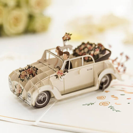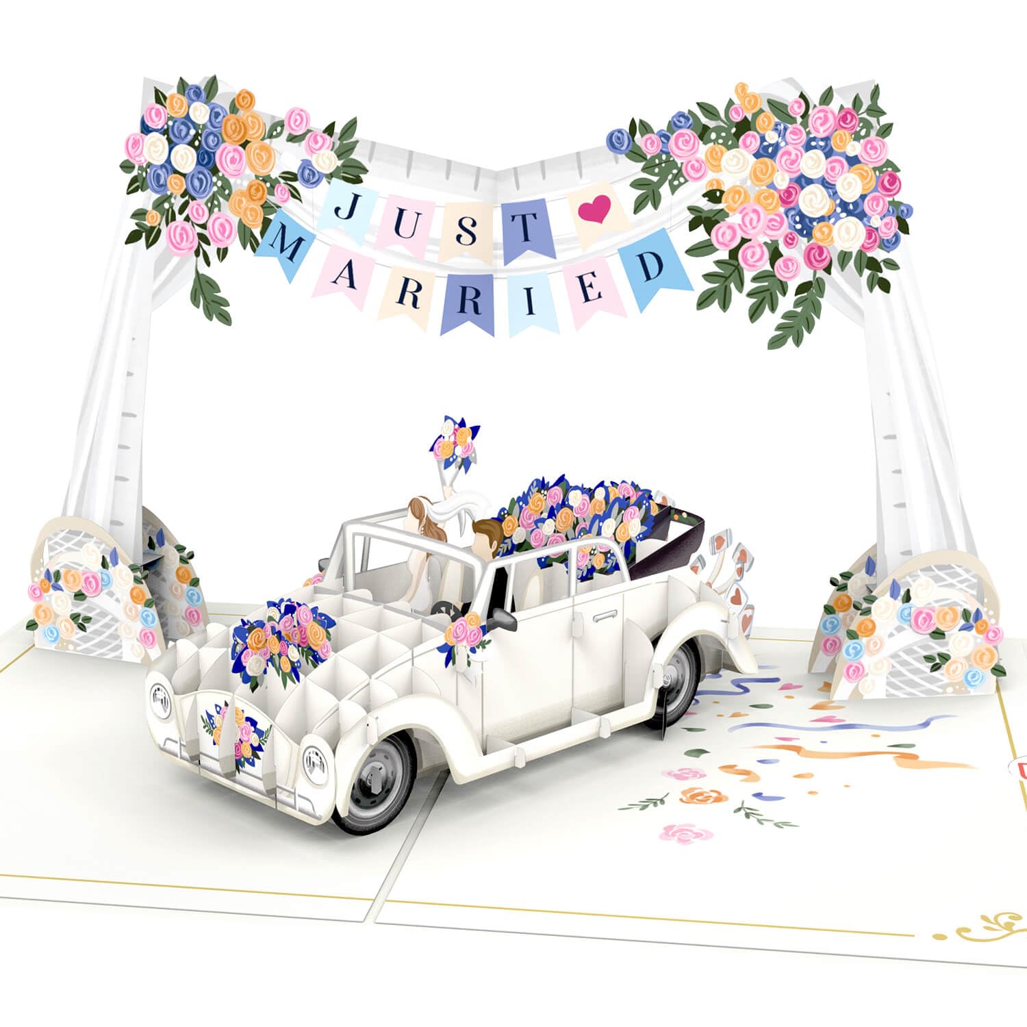 3D Pop-Up Hochzeitskarte Mit Vintage Auto | Just Married Design | Mit Umschlag & Geldgeschenk-Karte