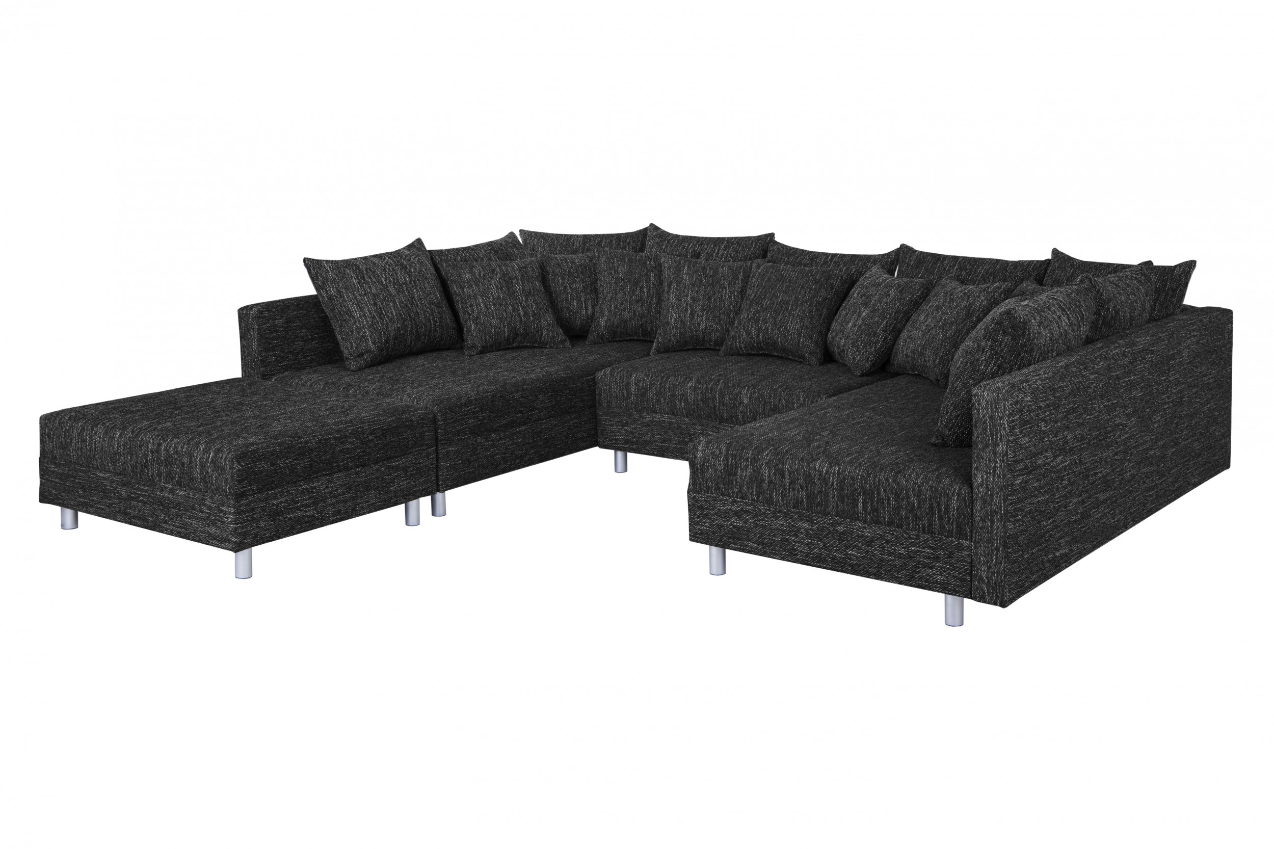 Mega bequem diese Ecksofa-Garnitur! Die Couch Minsk in schwarzem Strukturgewebe sieht einfach stylisch aus und bietet richtig viel Platz zum Lümmeln. Mit dem praktischen Hocker kannst du die Sitzfläche erweitern oder bequem die Füße hochlegen. Die Polsterung aus Formschaum auf Wellenfederkern gibt angenehmen Halt, die silbernen Kunststofffüße sehen edel aus. Maße: ca. 215,5 x 185 cm - da passt die ganze Familie drauf! Perfekt für gemütliche Filmabende oder wenn Besuch kommt.