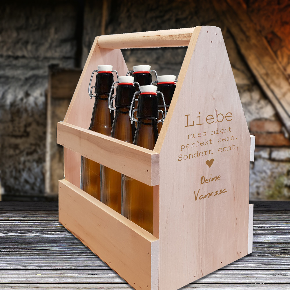 Das perfekte Geschenk für Bier-Liebhaber! Dieser stylische Bierträger aus FSC-zertifiziertem Holz im angesagten Shabby Chic Design ist einfach genial. Mit 6 separaten Fächern für Standardflaschen - kein Klirren und Bruch mehr! Integrierter Flaschenöffner an der Seite - immer bereit für den Durst. Mit nur 680g super leicht zu tragen, perfekt für Picknicks, BBQ oder Biergarten. Maße: 25x32x17cm. Das besondere Highlight: Kann personalisiert werden mit Namen, Spruch oder Logo per Lasergravur! Wird so zu einem einzigartigen Unikat. Ideal als Geburtstagsgeschenk, zum Vatertag, Hochzeit oder Einzug. Sieht nicht nur gut aus, sondern ist auch mega praktisch. Deutlich stylischer als langweilige Plastikkisten! So trägst du deine Getränke in echtem Retro-Charme. Ein Geschenk das garantiert ankommt!