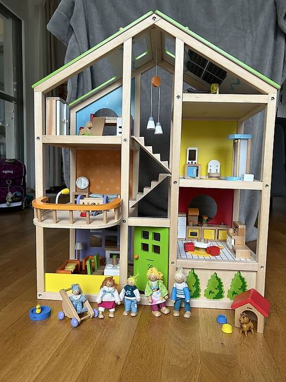 Die ganze Familie zieht ein! Dieses bezaubernde 6-teilige Puppenset von Hape bringt Leben in jedes Puppenhaus. Mit Oma, Opa, Mama, Papa und zwei Kindern kann dein Kind unendlich viele Familiengeschichten nachspielen. Die Holzpuppen haben weiche Körper, bewegliche Gliedmaßen und detailreiche Kleidung aus Stoff. Besonders praktisch: Die Wolle-Haare und die unterschiedlichen Frisuren machen jede Figur einzigartig. Das Set fördert die Kreativität und das Rollenspiel von Kindern ab 3 Jahren. Hergestellt aus hochwertigem Holz und ungiftigen Materialien - genau das, was man von der preisgekrönten Marke Hape erwartet (Oppenheim Toy Portfolio Gold Seal Award 2011). Perfekt für stundenlangen Spielspaß!