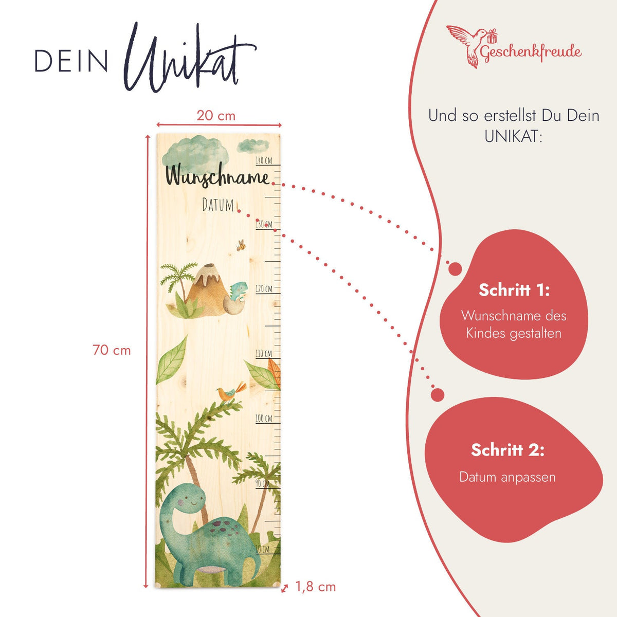 Oh, wie süß ist denn diese Messlatte? Perfekt um das Wachstum deines Kindes festzuhalten! Aus nachhaltigem Holz mit personalisierter Gravur - einfach vor dem Kauf den Text anpassen! Misst von 70cm bis 140cm - begleitet dein Kind durch die ganze Kleinkindzeit. Maße: 20cm breit, 1m hoch - gut sichtbar, aber nicht zu aufdringlich. Zwei Montage-Optionen: Mit Spezialklebeband (rückstandslos entfernbar!) oder klassisch mit Schrauben. Mit Laser-Gravur oder umweltfreundlicher Tinte - absolut kinderfreundlich und sicher! Jede Bestellung wird manuell geprüft - da passt alles perfekt! Kommt verpackt als Geschenk - ohne Rechnung im Karton, also ideal zum Verschenken! Ob fürs eigene Kinderzimmer oder als Geschenk für Freunde - damit machst du immer eine gute Figur! Einfach an die Wand, Kind dranstellen, markieren - und die schönsten Erinnerungen festhalten! Sieht total dekorativ aus und ist noch dazu mega praktisch!