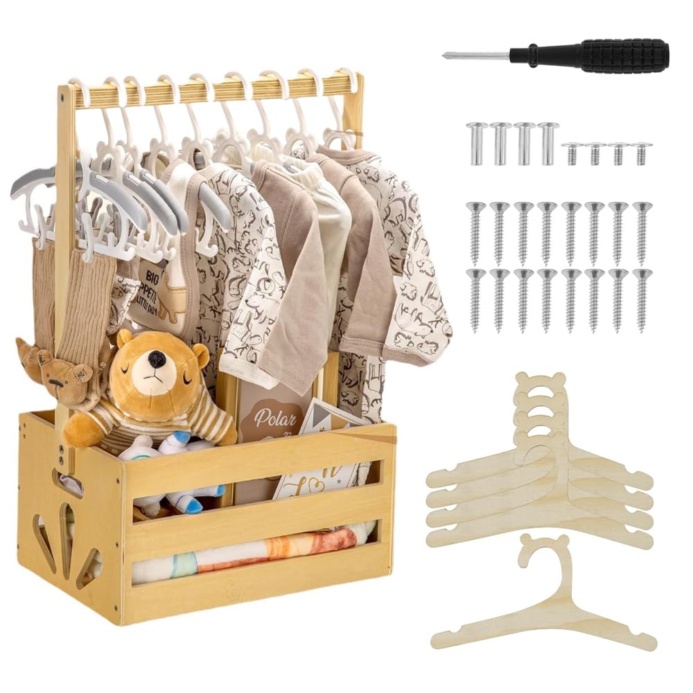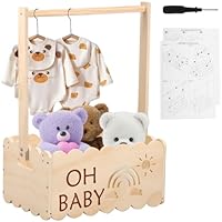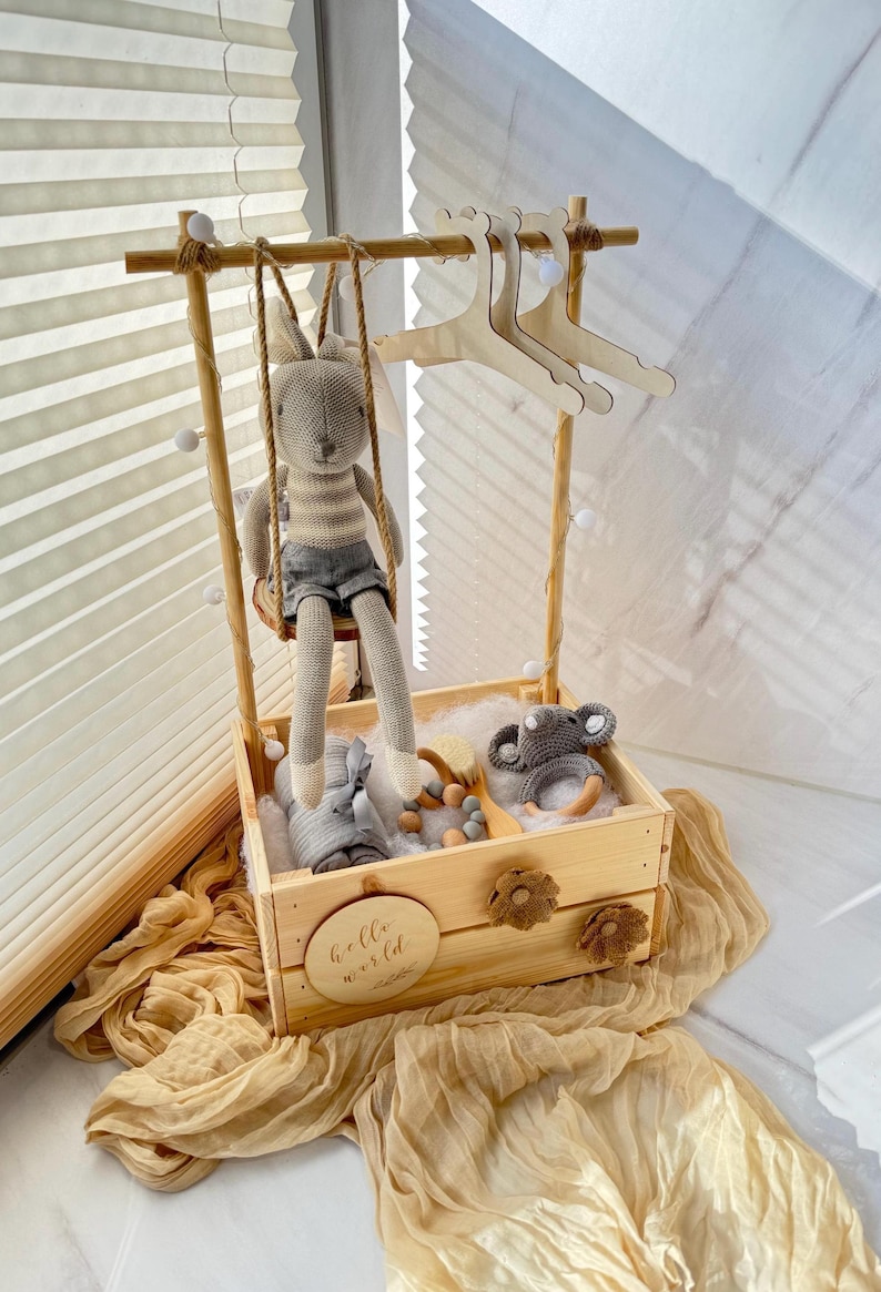 Holz Baby Geschenk Korb 34x23x51cm - Babykorb Mit 8 Kleiderbügeln Für Babyparty