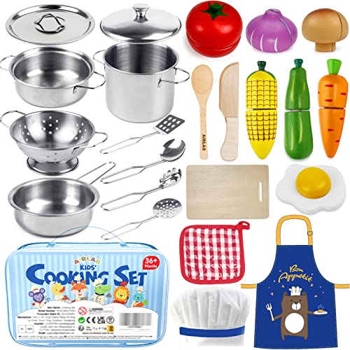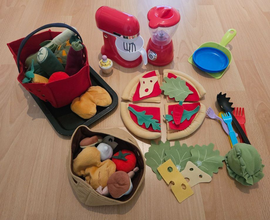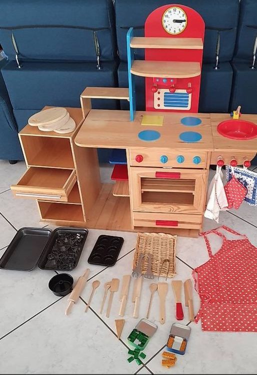 Backen macht Spaß - besonders mit diesem niedlichen Kinderküchen-Zubehör aus Holz! Im Set sind 12 ausstecherbare Kekse, 12 Beläge, Messer, Spatel, Backblech, Ofenhandschuhe, 2 Sticker-Sets und eine Aufbewahrungsbox enthalten - also wirklich alles was kleine Bäcker brauchen. Die Kinder können die niedlichen Aufkleber selbst auf Backblech und Messer kleben und so ihr persönliches Backset gestalten. Aus natürlichem Holz und mit wasserbasierter Farbe lackiert, ist alles sicher für Kinderhände. Die Kanten sind schön glatt geschliffen, damit sich niemand verletzt. Beim Back-Spiel trainieren die Kids ihre Feinmotorik und Koordination - und der Fantasie sind keine Grenzen gesetzt! Ob Kekse backen, dekorieren oder servieren - hier ist Spielspaß garantiert. Kommt in hübscher Verpackung an - perfekt als Geschenk zum Geburtstag, zu Weihnachten oder einfach so. Für Jungen und Mädchen ab 3 Jahren, die gerne in die Rolle von kleinen Köchen schlüpfen. Achtung: Nicht für Kinder unter 3 Jahren geeignet!
