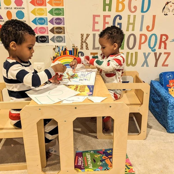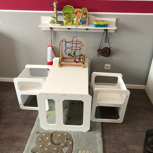 Ein eigenes Reich für die Kleinen! Dieses niedliche Tisch-und-Stuhl-Set aus Holz gibt Kindern ihren persönlichen Platz zum Essen, Malen, Spielen und Lernen. Nach Montessori-Prinzipien designed, fördert es die Selbstständigkeit und gibt den Kleinen das Gefühl, ganz groß zu sein. Mit integrierten Griffen an Tisch und Stühlen können Kinder alles selbst tragen und umstellen - super praktisch! Die robuste Holzkonstruktion ist stabil und kippsicher, mit abgerundeten Ecken für extra Sicherheit. Wenn's nicht gebraucht wird, schiebst du die Stühle einfach unter den Tisch - platzsparend und ordentlich. Perfekt fürs Kinderzimmer, Spielzimmer oder auch den Kindergarten. Ob zum Frühstück, Basteln, Puzzle bauen oder Hausaufgaben machen - hier fühlen sich Kinder einfach wohl. Ein wunderbares Geschenk zu Geburtstag, Weihnachten oder zum Kindergarteneintritt!