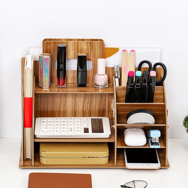 Schluss mit Chaos auf dem Schreibtisch! Dieses 3-stufige Regal aus Holz bringt Ordnung in dein Büro oder Zimmer. Mit den Maßen 34x30x17cm ist es kompakt aber geräumig genug für Stifte, Bürobedarf, Kosmetik oder andere Kleinigkeiten. Die glatten Kanten verletzen nicht die Hände, die natürliche Holzoptik sieht schick aus. Durch das mehrstufige Design siehst du alles auf einen Blick und hast immer den Überblick. Spart Platz und reduziert Unordnung - ob im Homeoffice, Studentenzimmer oder Kinderzimmer. Stabil verarbeitet und langlebig. Einfach hinstellen und sofort nutzen. Macht nicht nur Ordnung, sondern sieht auch noch dekorativ aus. Endlich alles griffbereit und organisiert!