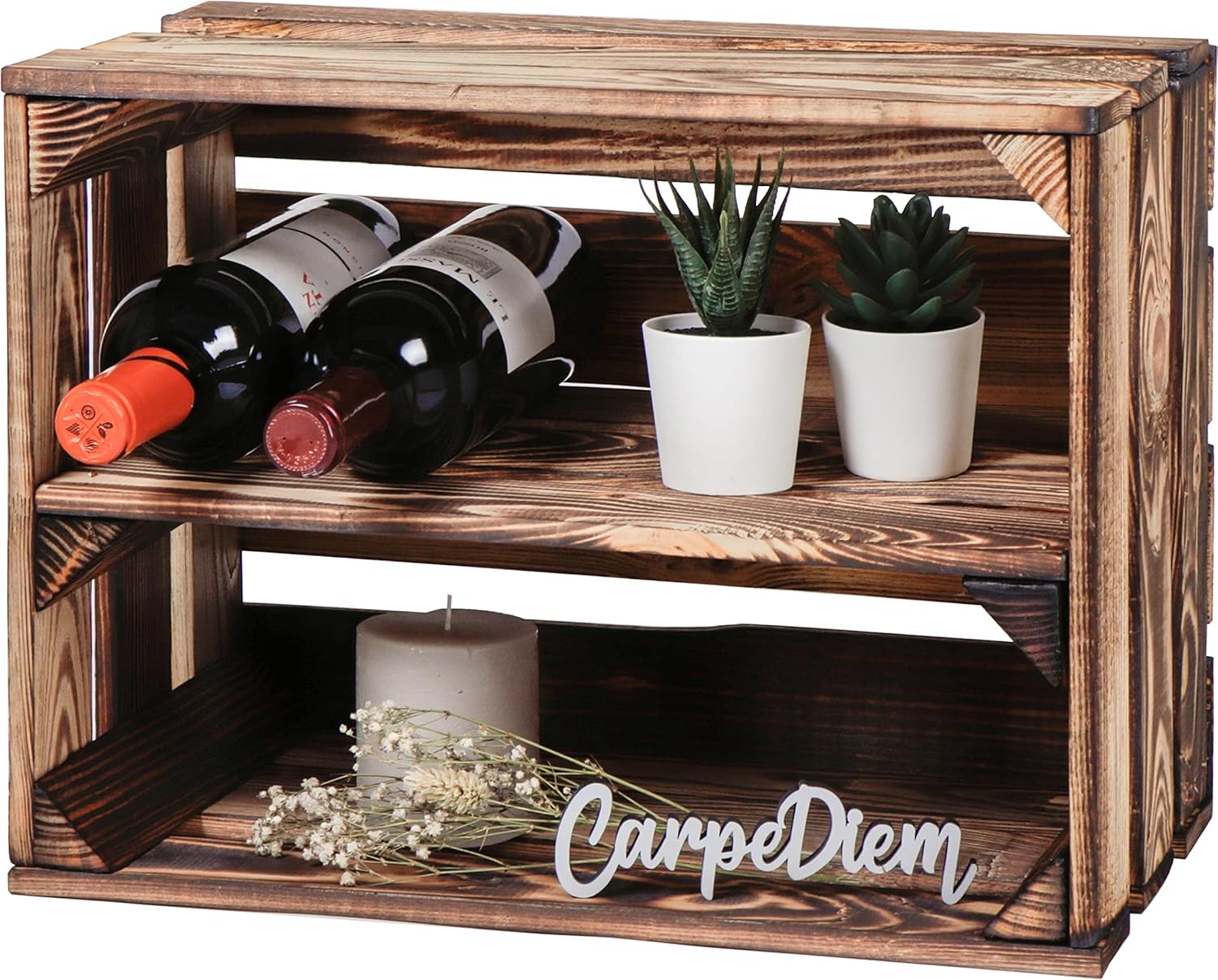 Diese vintage Holzkiste von LAUBLUST ist total vielseitig! Sie sieht nicht nur super aus mit ihrem rustikalen, geflammten Design, sondern ist auch mega praktisch. Mit dem eingebauten Regalboden hast du gleich doppelt so viel Stauraum!\n\n• Maße: ca. 40 x 30 x 25 cm - perfekte Größe\n• Mit festem Regalboden - mehr Ordnung\n• Aus massivem Kiefernholz - stabil und langlebig\n• Geflammte Optik - wunderschöner Vintage-Look\n• Vielseitig nutzbar: Für Wein, Deko, als Regal\n\nEgal ob im Wohnzimmer, Flur oder Garten - diese Kiste passt überall hin! Du kannst sie als Weinkiste nutzen, als Bücherregal an die Wand hängen, als Schuhregal im Flur oder einfach als Deko-Element mit Blumen drin.\n\nDas Tolle: Die Kisten sind kombinierbar! Wenn du mehrere hast, kannst du dir damit ein ganzes Regalsystem bauen. Super für DIY-Fans! Die Qualität ist top - das Holz ist schön stabil und die Oberfläche ist lackiert, damit es lange schön bleibt.\n\nPerfekt für alle, die es gemütlich und individuell mögen. Ob als Geschenk oder für dich selbst - mit dieser Kiste holst du dir rustikalen Charme ins Haus!
