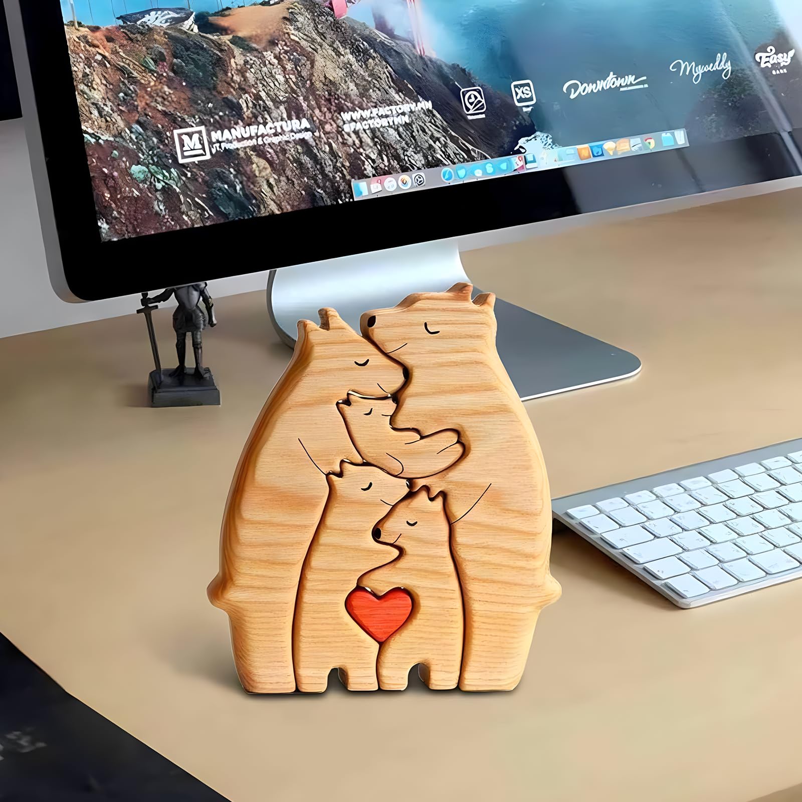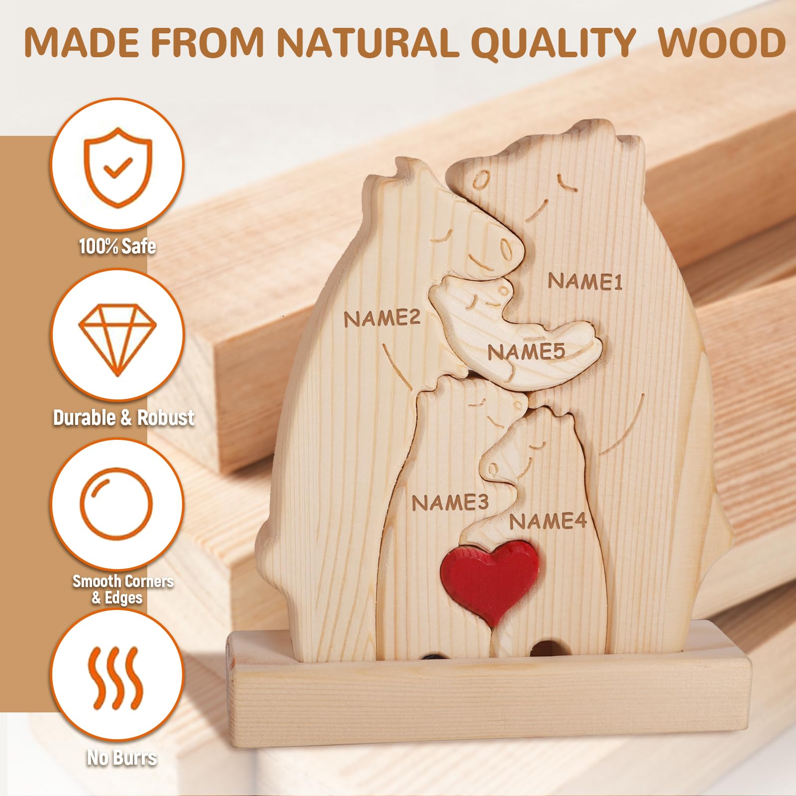 Ein ganz besonderes Geschenk für die ganze Familie! Dieses personalisierte Bären-Holzpuzzle verewigt die Namen deiner Liebsten in einer wunderschönen Holzskulptur. \\n\\nDu kannst 2 bis 9 Namen gravieren lassen - perfekt für Familien, Paare oder Freundeskreise. Jedes Puzzle wird durch präzises Laserschneiden individuell angefertigt, sodass die einzelnen Teile perfekt zusammenpassen. \\n\\nAus hochwertigem, naturbelassenem Holz gefertigt, ist jedes Stück ein Unikat mit seiner eigenen Maserung. Die Oberfläche ist glatt und gratfrei - absolut sicher in der Handhabung, auch für Kinder. \\n\\nNicht nur ein dekoratives Highlight für Wohnzimmer, Büro oder Regal, sondern auch ein Symbol für Zusammenhalt und Verbundenheit. \\n\\nPerfect für: \\n- Hochzeitsgeschenke \\n- Geburtstage \\n- Weihnachten \\n- Valentinstag \\n- Jahrestage \\n- Familientreffen \\n\\nTechnische Daten: \\n- Größe: 10-15 cm \\n- Dicke: 1,8 cm \\n- Material: Naturholz \\n- Gravur: 2-9 Namen \\n\\nEin Geschenk, das von Herzen kommt und für immer bleibt!