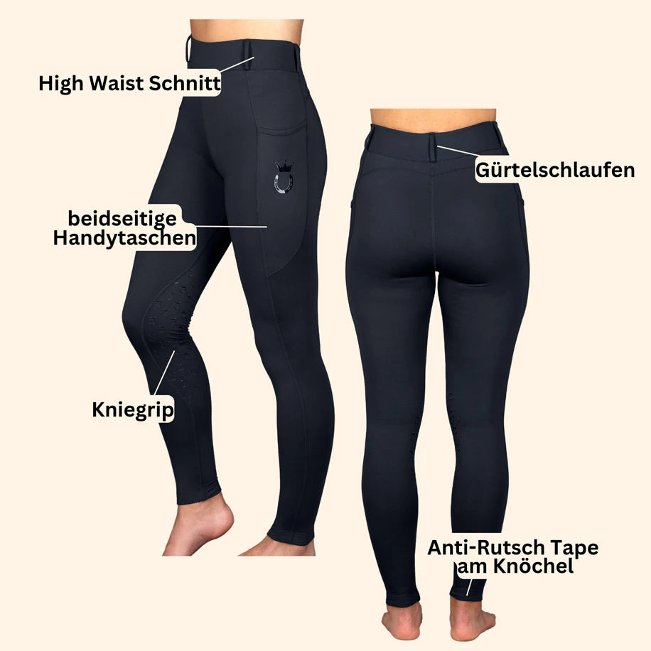Winter? Kein Problem mit diesen kuscheligen Reitleggings! Das Innenfleece hält dich richtig warm, auch bei kaltem Wetter. Der herzförmige Silikonbesatz gibt dir super Halt im Sattel - ohne zu kleben oder zu zwicken. Und das Beste: Die Herzform zaubert eine tolle Silhouette! Mit zwei tiefen Taschen kannst du dein Handy und andere wichtige Dinge sicher mitnehmen. Der Highwaist-Sitz sitzt perfekt und die Gürtelschlaufen sind praktisch für deinen Reitgurt. Noch ein Pluspunkt: Die Leggings ist aus recyceltem Polyester und GRS zertifiziert - gut für die Umwelt also! Royal Horsemen ist ein junges Familienunternehmen aus Engelskirchen, das Nachhaltigkeit im Reitsport voranbringt. Also: Warm, stylisch und nachhaltig - was will man mehr?