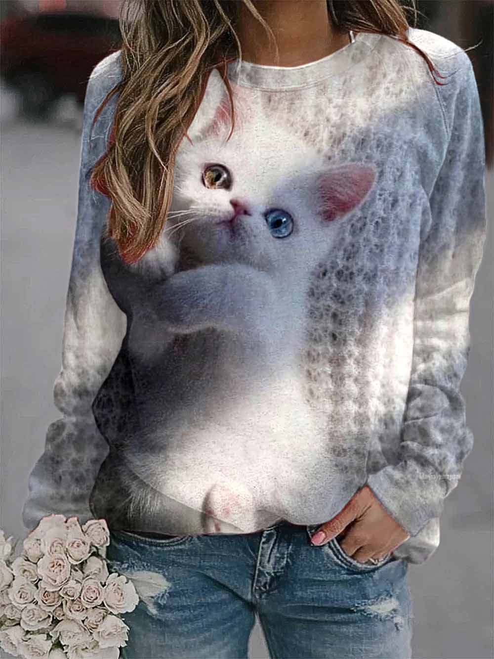 Damen Sweatshirt Mit Hunde-Katzen Herzmuster - Flauschiger Pullover Für Herbst & Winter