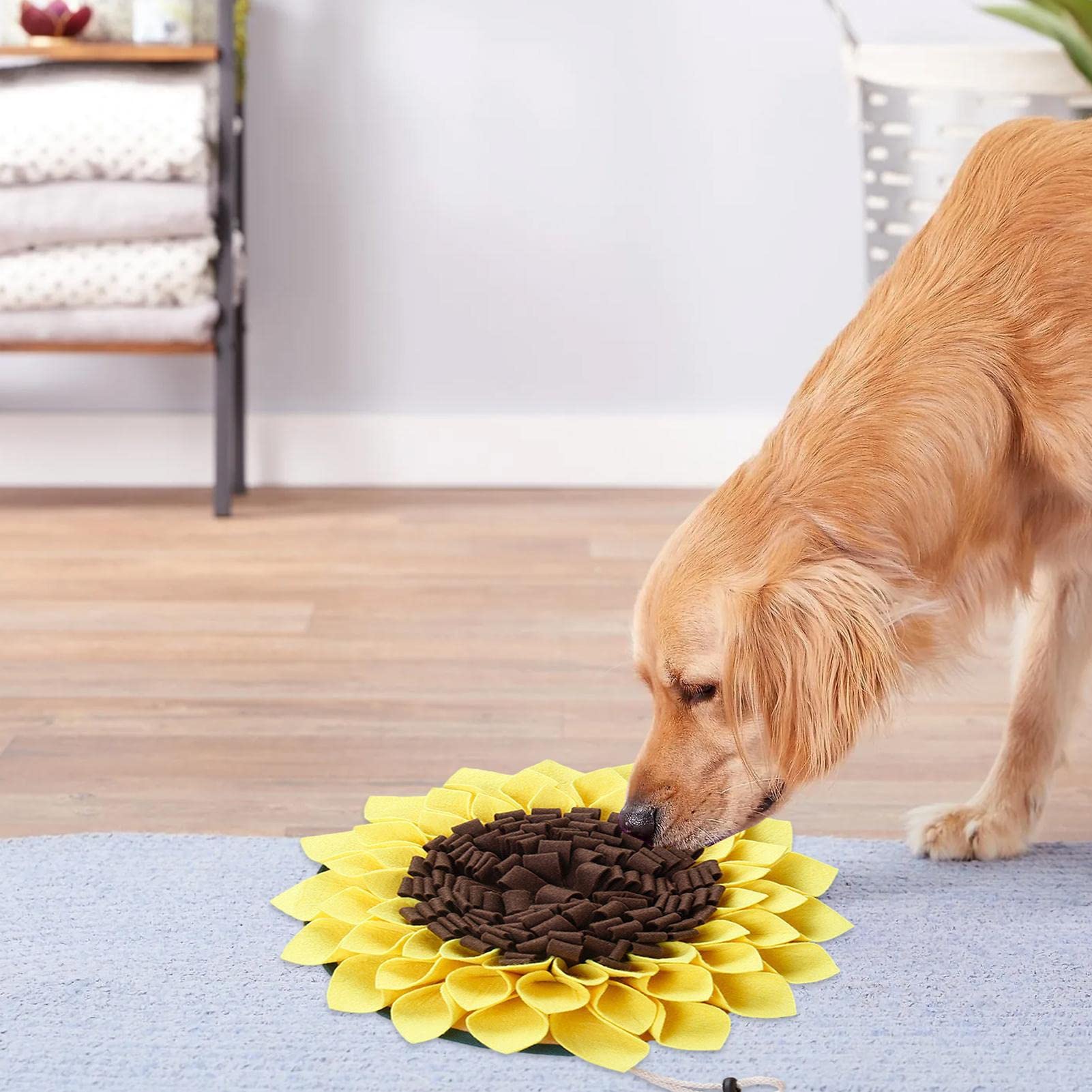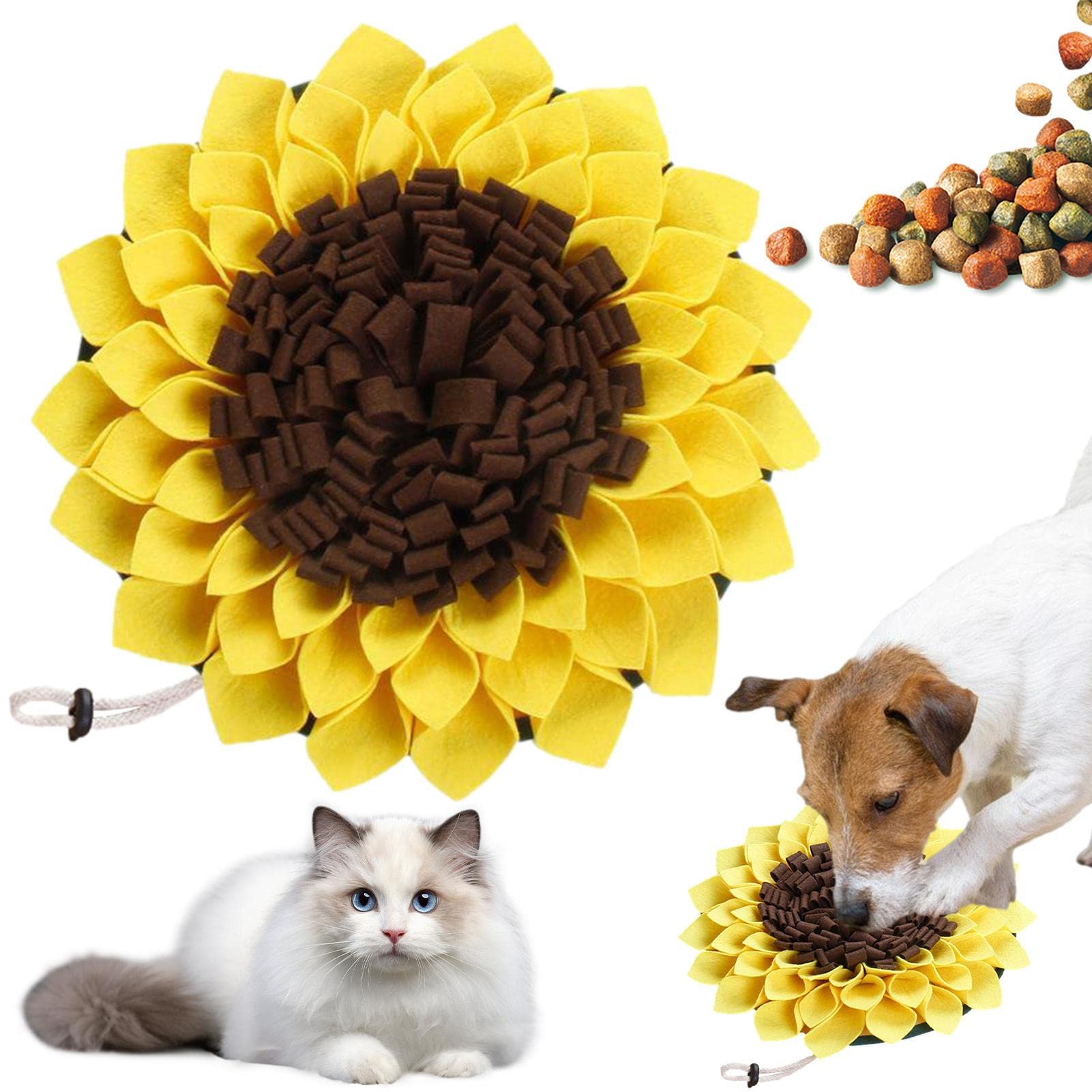 Dein Hund schlingt sein Futter runter? Mit dieser Schnüffelmatte in Sonnenblumen-Form wird jede Mahlzeit zum Abenteuer! Aus langlebigem Filz, 38 x 38 cm groß. Einfach Leckerlies in der Matte verstecken und dein Hund muss suchen – das trainiert seinen Geruchssinn, reduziert Stress und verlangsamt das Fressen. Ideal für kleine bis große Hunde. Leicht zu falten und zu reinigen. Perfekt für drinnen und unterwegs. So macht Fütterung Spaß und fördert die natürlichen Instinkte deines Vierbeiners. Einfach ausprobieren und staunen, wie begeistert dein Hund ist!
