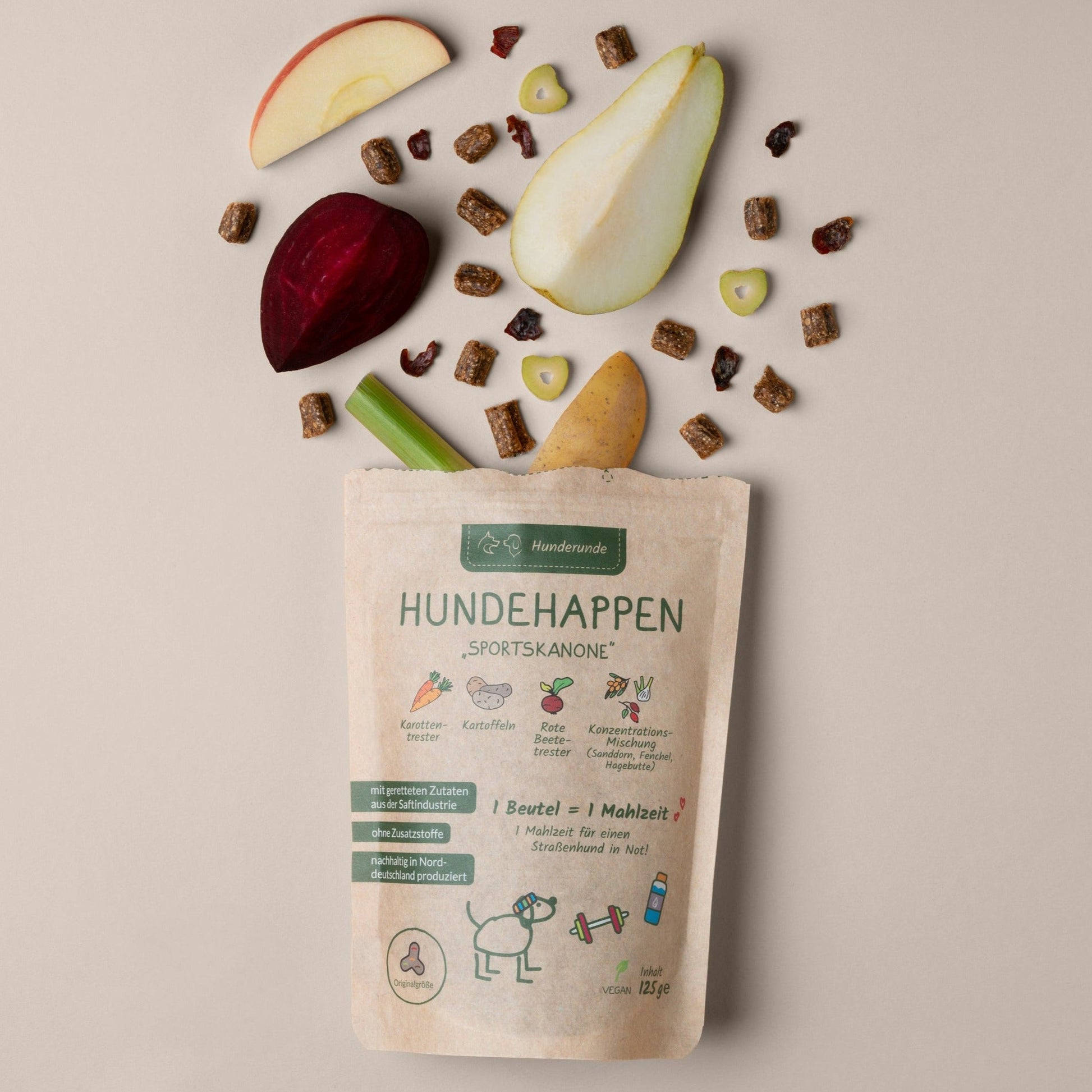 Wow, veganes Hundefutter das wirklich schmeckt! Hunderunde Knabberhappen ist komplett pflanzlich, aber trotzdem vollwertig und nährstoffreich. Mit Insektenprotein, Kichererbsen, Linsen und Süßkartoffel bekommt dein Hund alles, was er braucht. Besonders gut für Hunde mit Allergien oder empfindlichem Magen, weil's komplett getreidefrei ist. Leinöl und Bierhefe sorgen für glänzendes Fell und gesunde Haut, während Fenchel und Kamille die Verdauung unterstützen. Ohne künstliche Zusätze oder Zucker - nur das Beste für deinen Liebling! Das Coole: Hunderunde produziert CO₂-neutral, die Verpackung ist plastikfrei und mit jedem Kauf werden 14 Mahlzeiten an Hunde in Not gespendet. Mit 60-Tage-Verträglichkeitsgarantie kannst du's risikofrei testen. Dein Hund wird's lieben - und du tust noch was Gutes für die Umwelt!