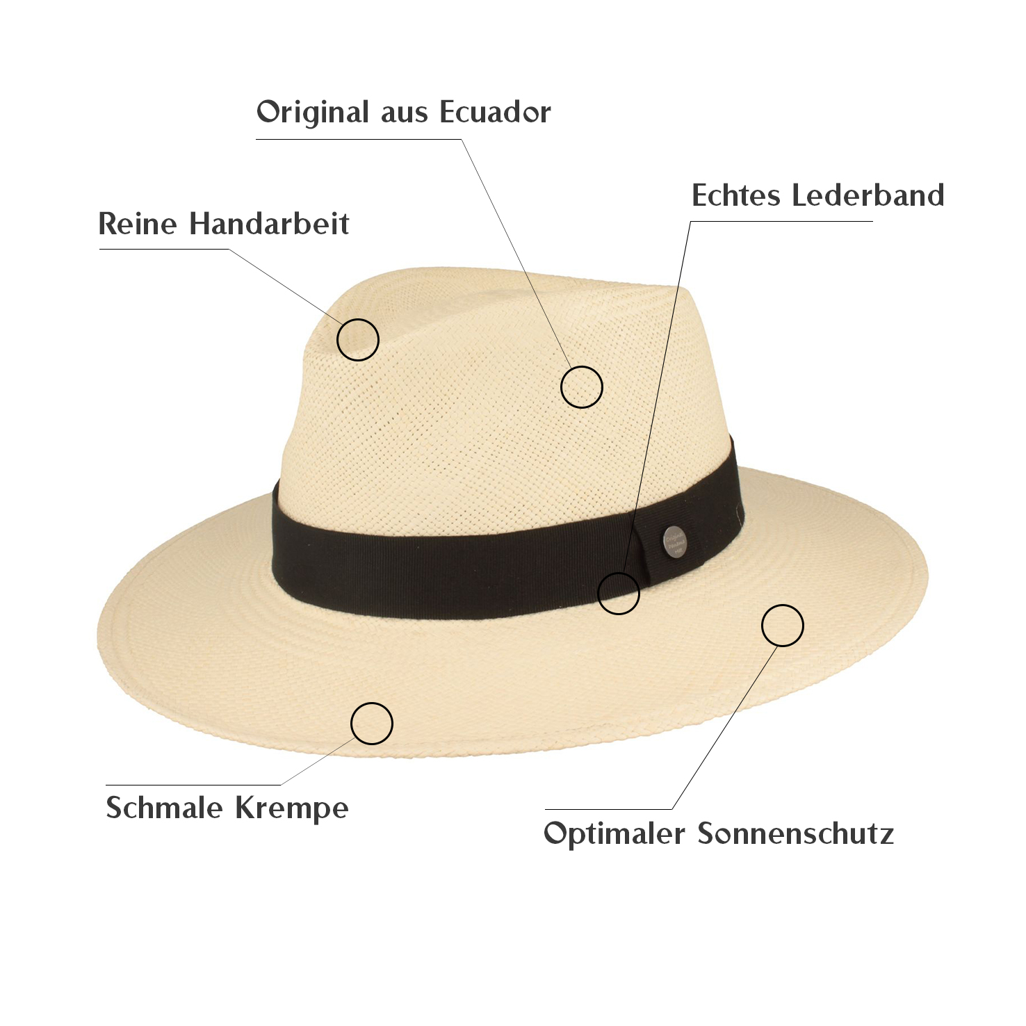 Sommerlicher Style mit Tradition! Dieser echte Panama Hut wird in Ecuador aus feinstem Toquilla-Stroh gehandcrafted. Mit UV-Schutz 40+ schützt er optimal vor Sonne - perfekt für lange Tage im Freien. Die elegante Bogarthut-Form mit 6,7 cm breiter Krempe und schwarzem Garniturband passt zu jedem Sommer-Outfit. Das weiche Stofffutterband innen sorgt für perfekten Tragekomfort. Von der renommierten Montecristi-Manufaktur - Qualität, die man sieht und fühlt. Der ideale Begleiter für Urlaub, Gartenpartys oder Stadtbummel. Zeitlos schön und praktisch!
