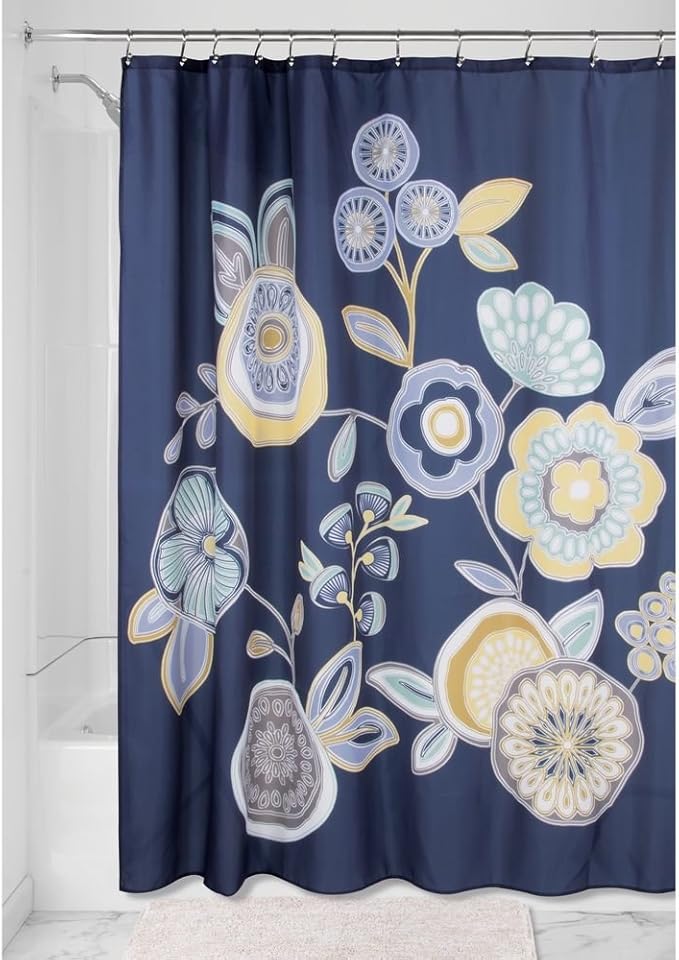 Dieser iDesign Duschvorhang bringt Frische ins Bad! Mit 183x183 cm Standardmaß passt er an die meisten Duschstangen. Das schöne Blütendesign in Blau/Schwarz sieht richtig edel aus. Aus hochwertigem Polyester - weich wie Stoff, aber trotzdem robust und wasserdicht. Hält das Wasser sicher in der Dusche, kein Ärger mit nassen Böden mehr! 12 Metallösen sorgen für stabilen Halt an der Stange. Einfach zu reinigen: Maschinenwäsche und Trockner geeignet. iDesign steht seit über 40 Jahren für innovative Haushaltsprodukte - Qualität die überzeugt! Perfekt um dein Bad zu verschönern und gleichzeitig praktischen Schutz zu bieten. Macht aus jedem Badezimmer einen stylischen Raum. Ob Mietwohnung oder Eigenheim - dieser Vorhang setzt Akzente!