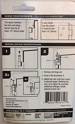 Endlich keine angestoßenen Türen mehr! Der Nuk3y Door Saver II ist genial einfach: Er ersetzt den normalen Scharnierstift und stoppt die Tür sanft bevor sie gegen die Wand knallt. Ultraflaches Design in satinierter Nickel-Optik sieht super aus und bleibt diskret. Installation in 3 einfachen Schritten: Alten Stift raus, Door Saver rein, obere Nocke auf gewünschten Winkel einstellen - fertig! Ohne Werkzeug! Passt für Scharniere von 7,6cm bis 11,4cm mit 1/4 Zoll Stift-Durchmesser. Wichtig: Mindestens 0,6cm Abstand zwischen Verkleidung und Scharnierrohr einplanen. Aus robustem Karbonstahl der wirklich hält. Einfach das beste Upgrade für jede Tür!