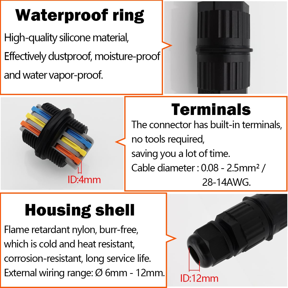 Professionelle wasserdichte Verbinder für Außenbereich! IP68 geschützt - absolut dicht gegen Wasser und Staub. 3-polig für sichere Verbindungen, Nennstrom 16A und 450V. Passt für Kabeldurchmesser 5-12mm. Aus Nylon PA66 mit Flammhemmend UL94V-0. Temperaturbereich -40°C bis +105°C. Automatisches Verriegelungsdesign verhindert loses Lösen. Einfache Panel-Montage in 20-21mm Öffnung. Ideal für Außenbeleuchtung, LED-Leuchten, Gartenbeleuchtung oder Reparaturen. Verkabelungskapazität 0,5-2,5mm². Einfach zu installieren - Plug-and-Play. Hält auch bei extremen Wetterbedingungen. Perfekt für Elektriker und Heimwerker. Macht deine Elektroinstallationen absolut wetterfest!