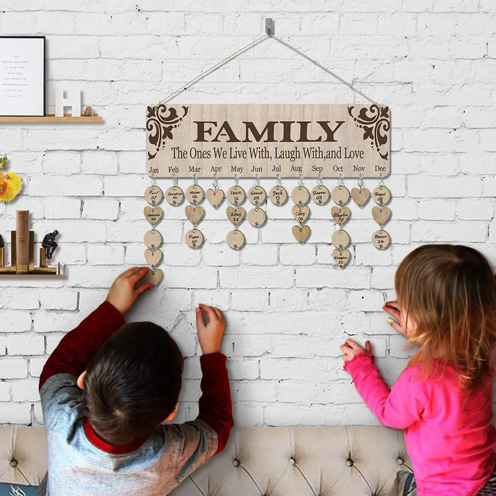Nie wieder Geburtstage vergessen! Dieser süße Holz-Kalender hilft dir, alle wichtigen Termine im Blick zu behalten. Maße: 40 x 12 x 0,5 cm. Inklusive 50 Holzplättchen (25 rund, 25 Herzform) mit 3cm Durchmesser. Einfach Daten und Namen auf die Plättchen schreiben und an die entsprechende Stelle hängen. Mit Hanfseil und Sprungringen zum Aufhängen. Perfekt für Familien, WG's oder Menschen mit vielen Freunden. Super als Geschenk zu Weihnachten, Muttertag oder Geburtstag. Macht sich auch toll als Wanddekoration!