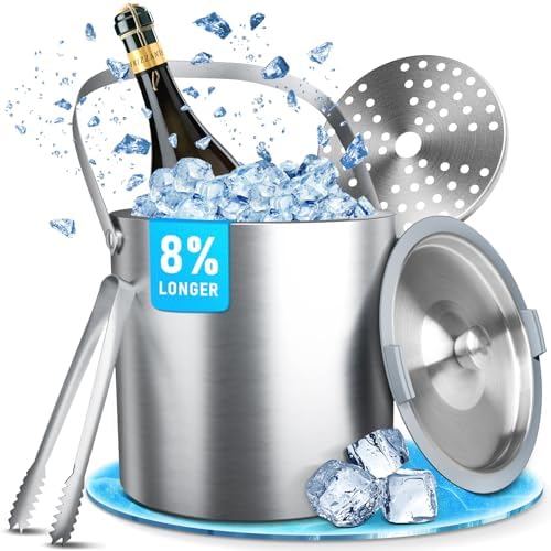 Stylisher Eiskübel für deine nächste Party! Dieser 3-Liter Edelstahl-Behälter mit doppelwandiger Isolierung hält Eiswürfel stundenlang kalt. Mit 19cm Durchmesser und 18cm Höhe passt er super auf jeden Tisch oder Tresen. Im Lieferumfang ist alles dabei: praktische Eiszange zum einfachen Entnehmen der Eiswürfel, herausnehmbares Edelstahlsieb das Schmelzwasser von den Eiswürfeln trennt, und ein dichter Silikondeckel der das Schmelzen verzögert. Perfekt für Bier, Champagner, Wein, Cocktails oder andere Getränke die gekühlt werden sollen. Ob für Gartenpartys, Grillfeste, Geburtstage oder Feiern - dieser Eiskübel ist immer der Hit! Leicht zu reinigen mit feuchtem Tuch (nicht in Spülmaschine!), das Sieb einfach herausnehmen. Mit praktischem Griff super zu transportieren. In schwarzem Design sieht er dazu noch richtig edel aus - Funktionalität trifft auf Style!